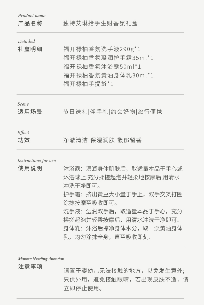 商品名称:Dear lrean/独特艾琳福开禄柚抬手生财香氛礼盒-洗手液版