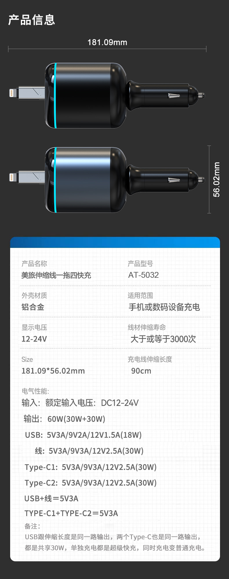 商品名称:Auto Travel/美旅一拖四伸缩线车载充电器AT-5032