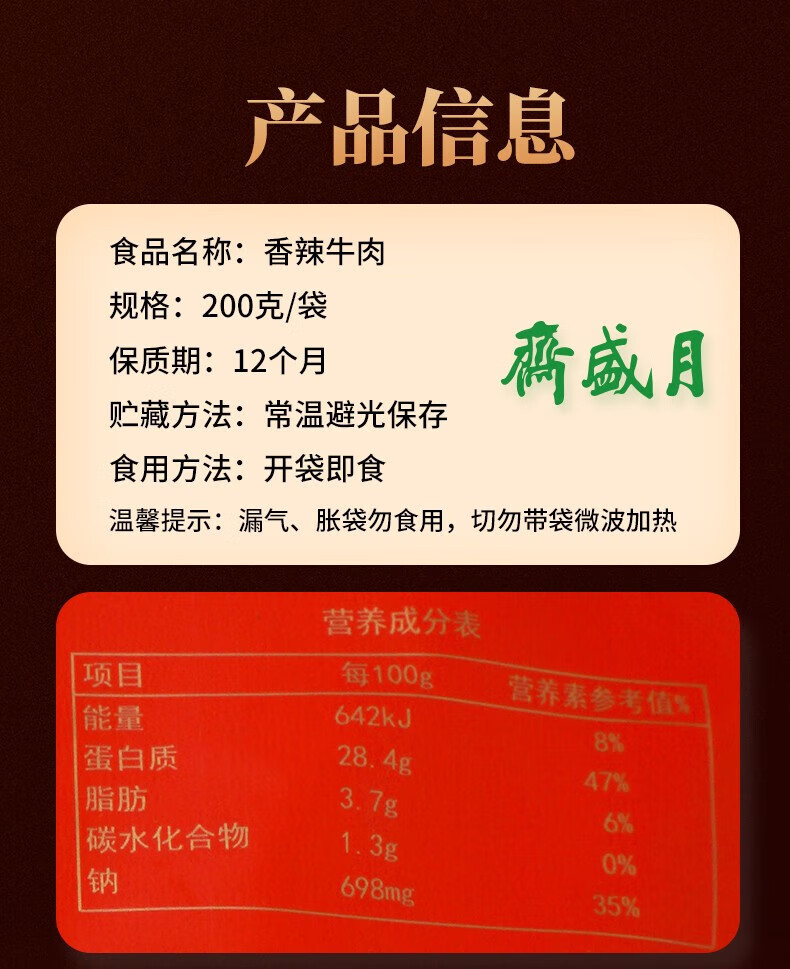 商品名称:月盛斋香辣牛肉200g*2袋