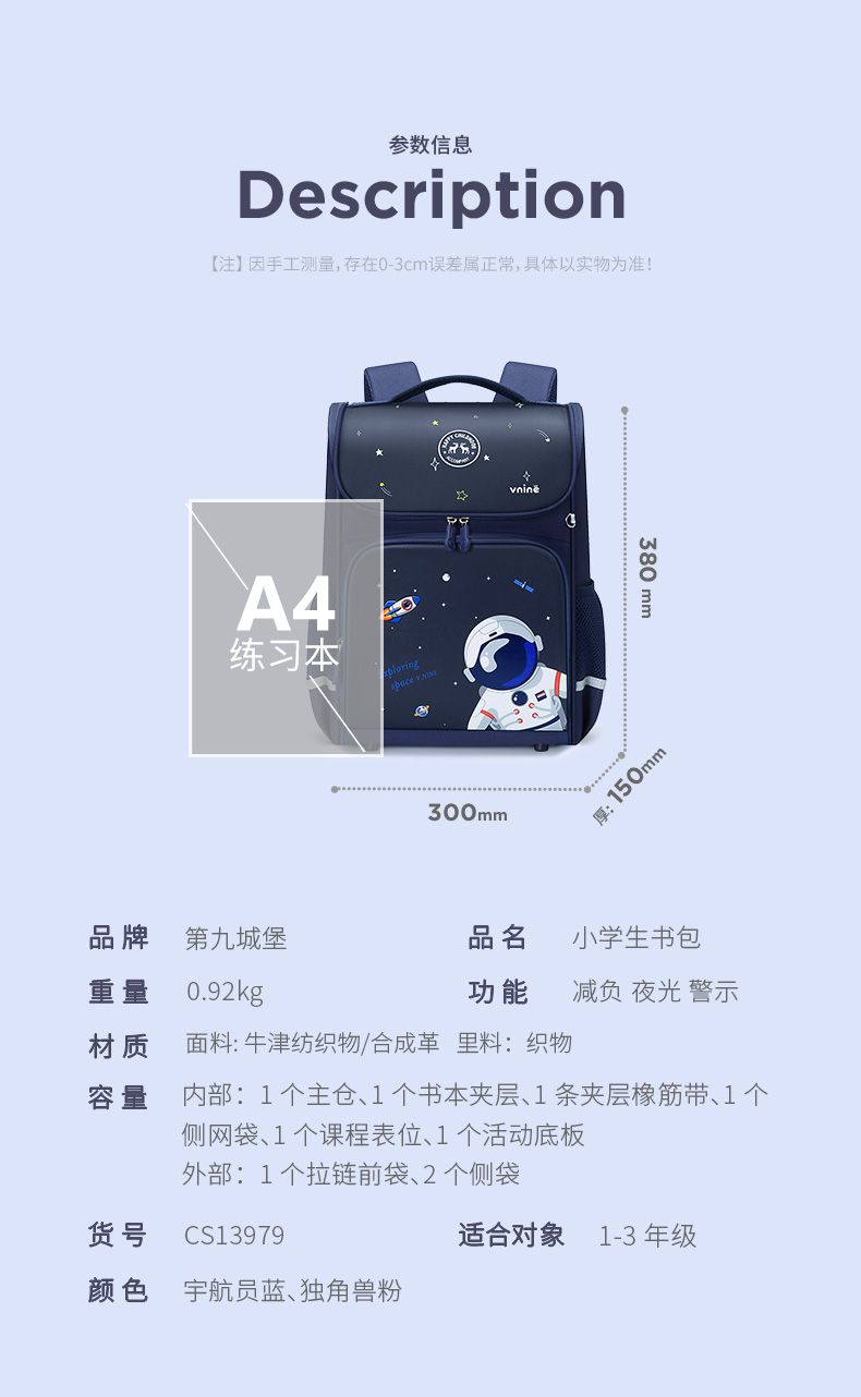 商品名称:Vnine City香港第九城堡 小学生儿童书书包CS13979
