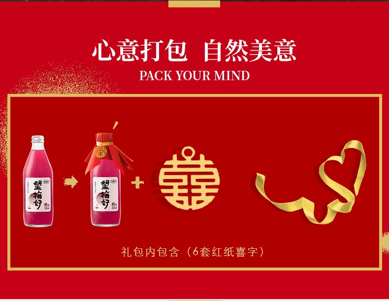 商品名称:好望水 望梅好300ml*3瓶+望杏福300ml*3瓶(泡沫)/箱+红纸配饰