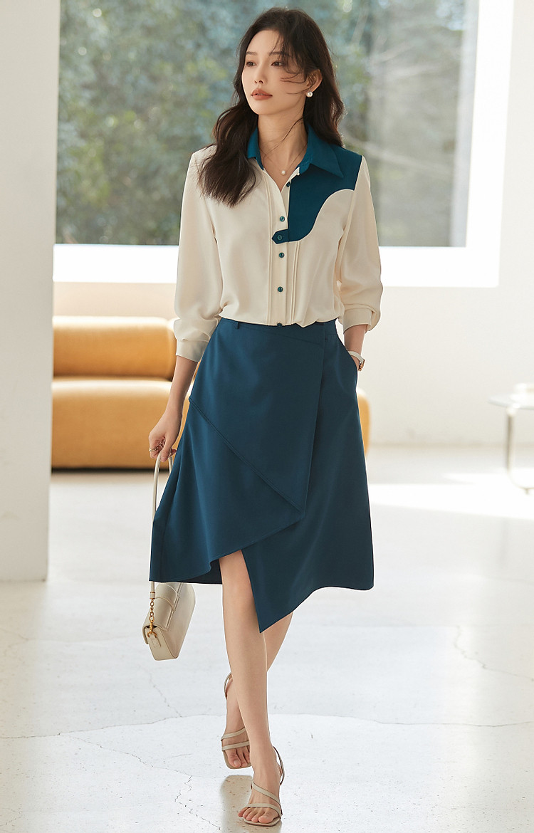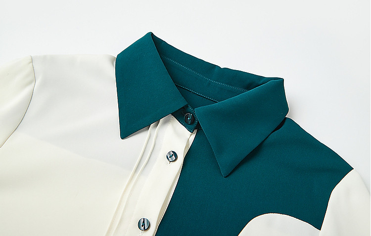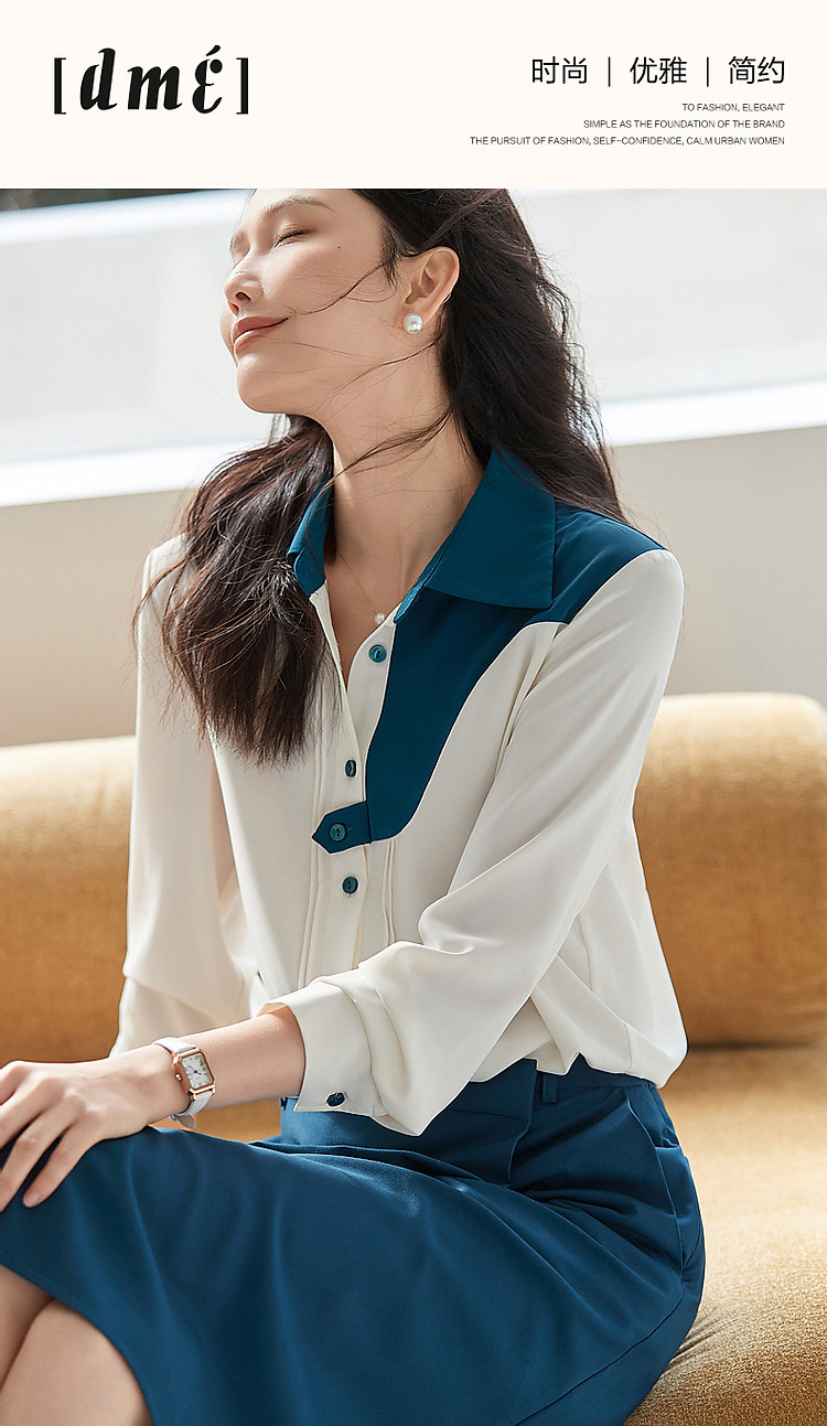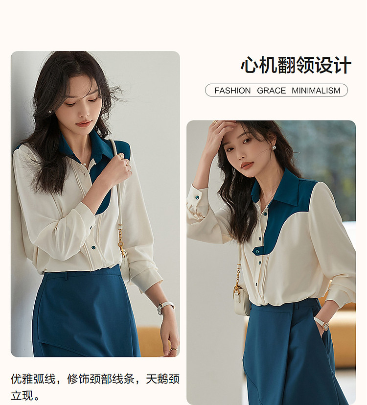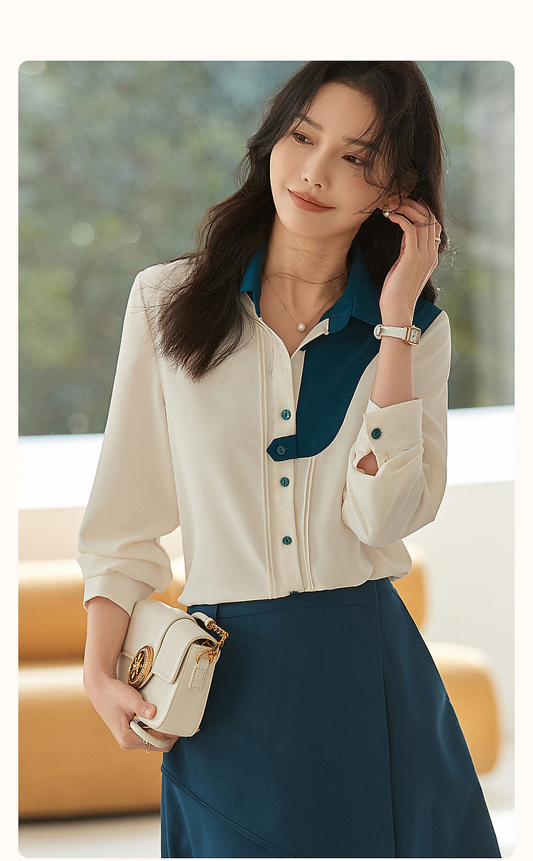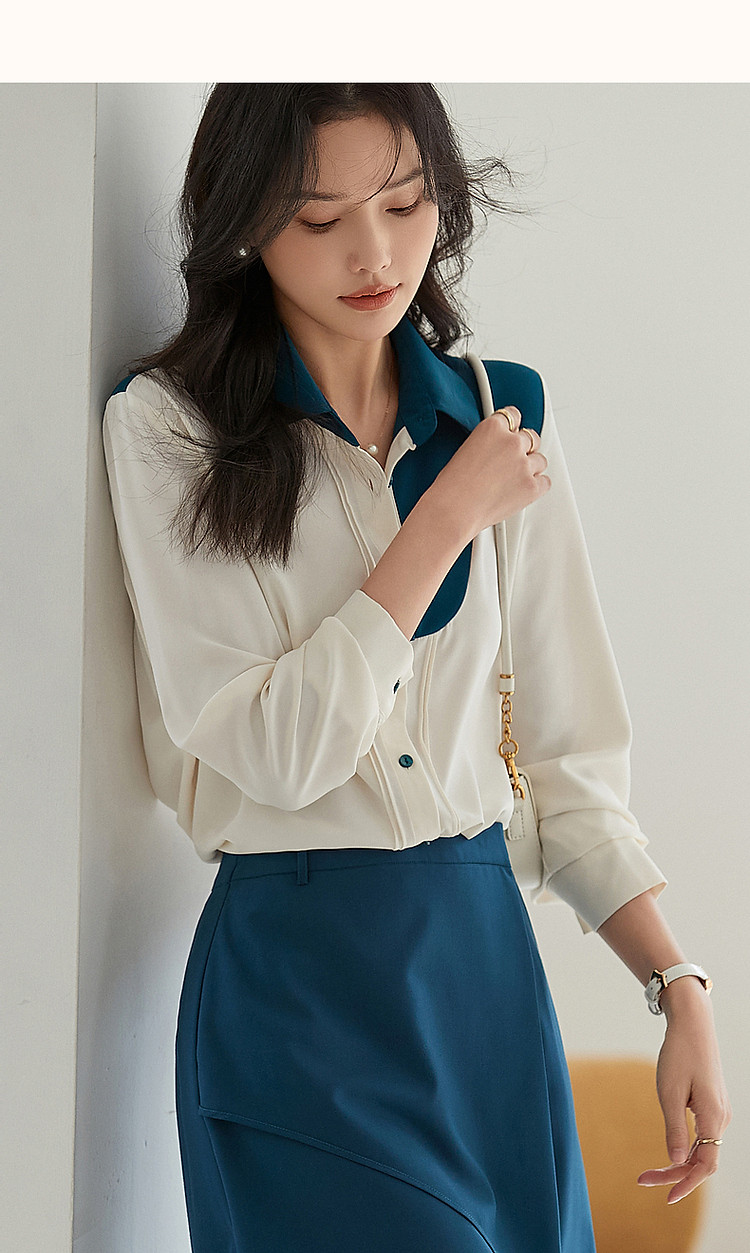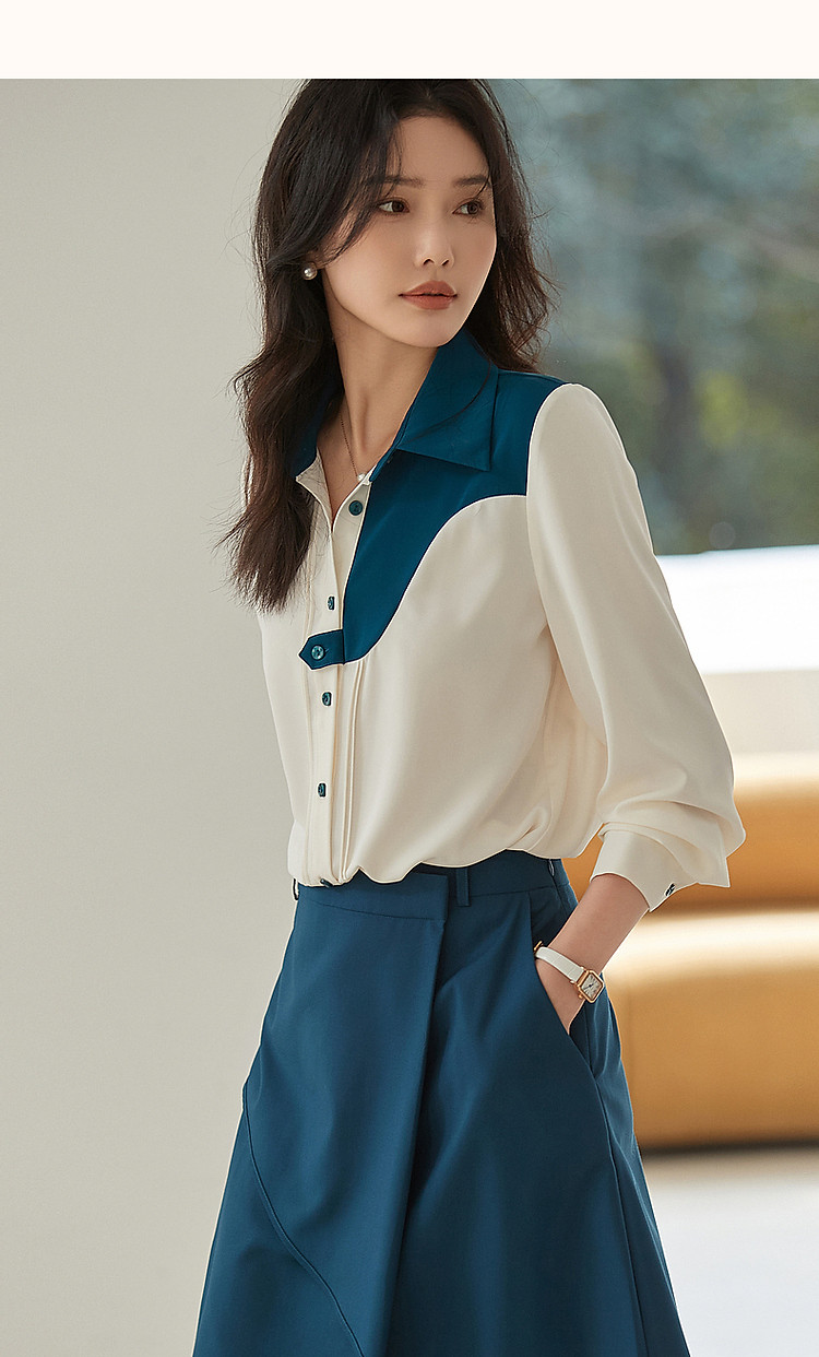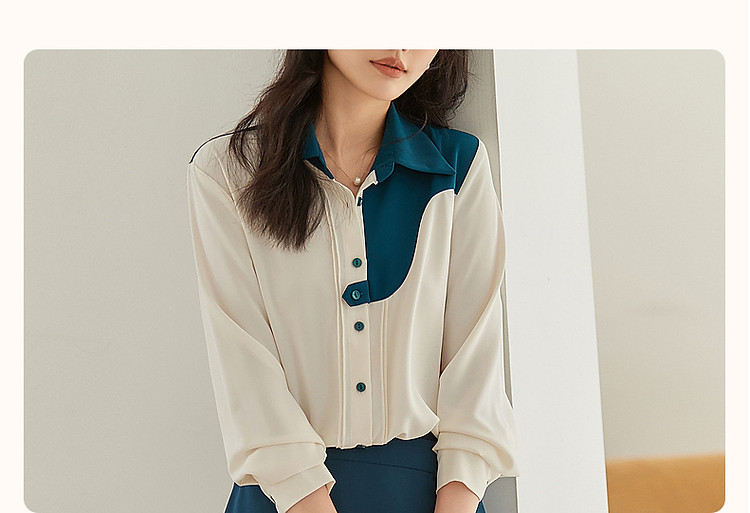 商品名称:【法式不规则拼接衬衫】秋翻领拼色衬衣女装上衣 117057