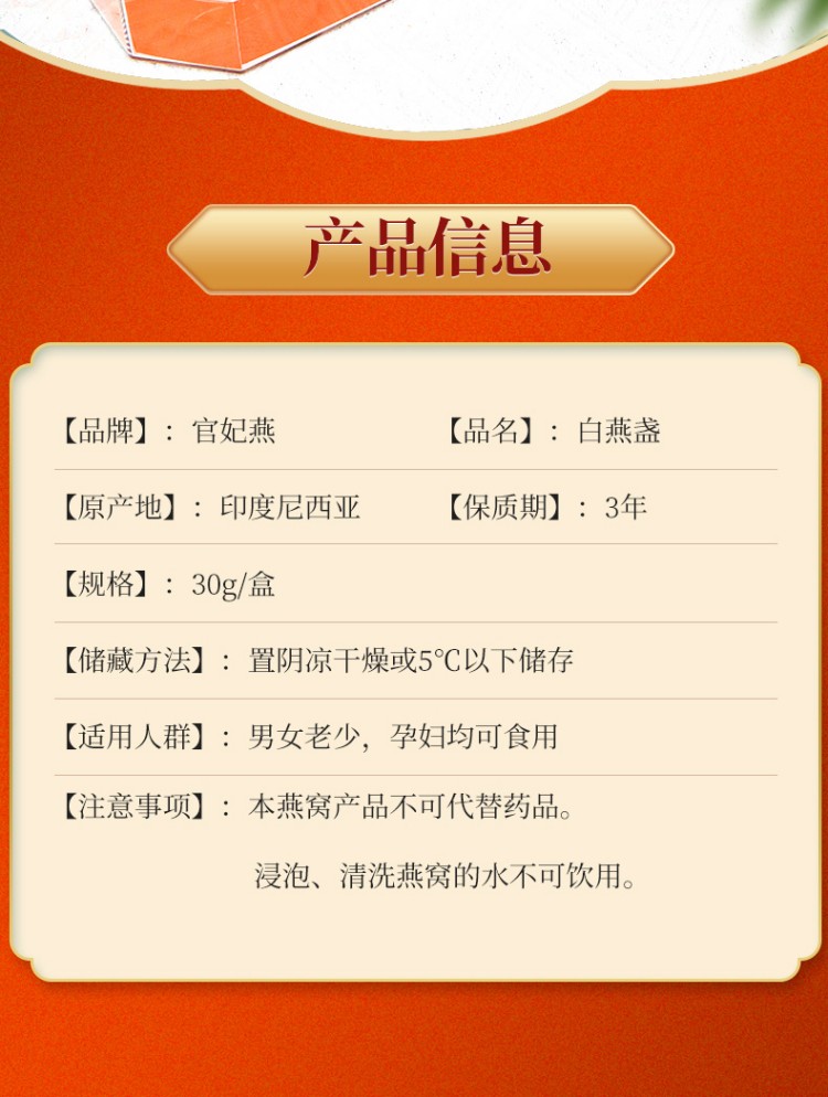 商品名称:官妃燕疏盏白燕盏礼盒30g