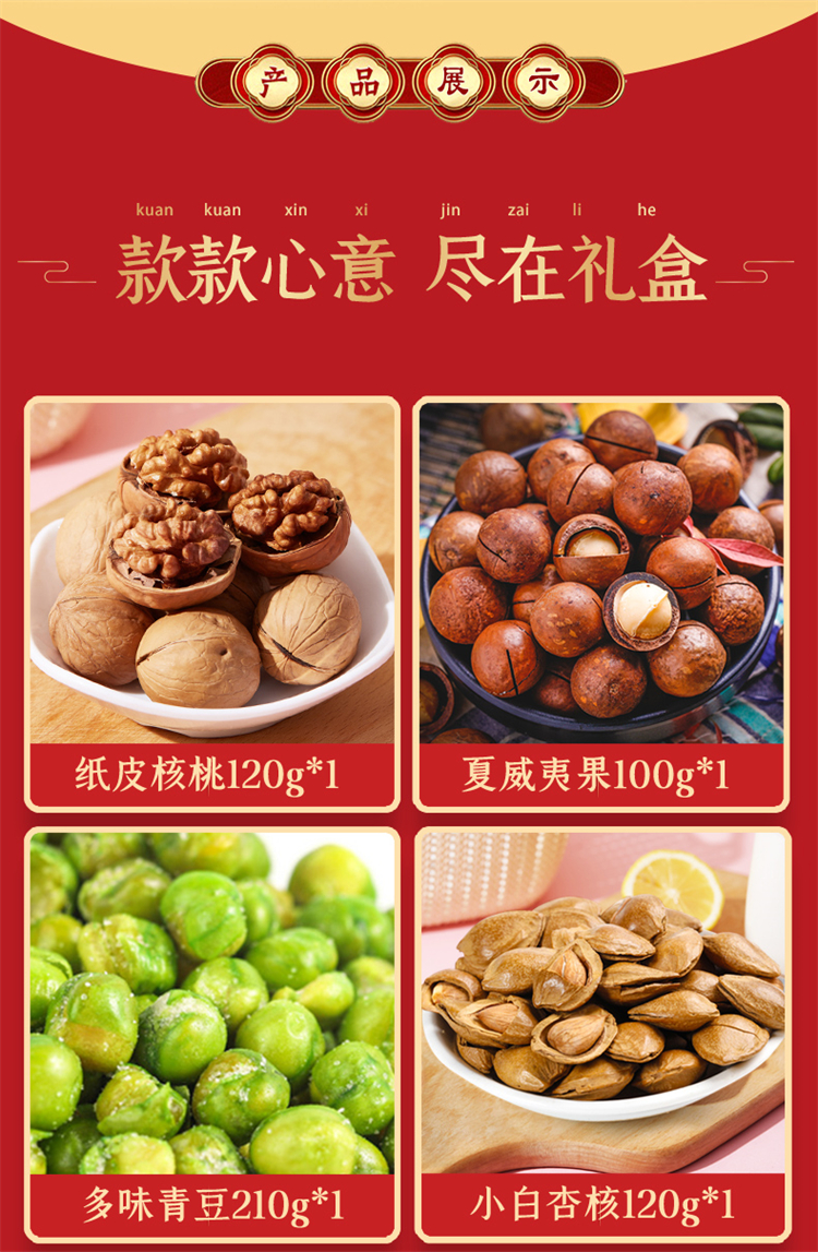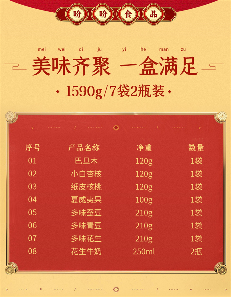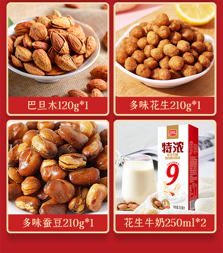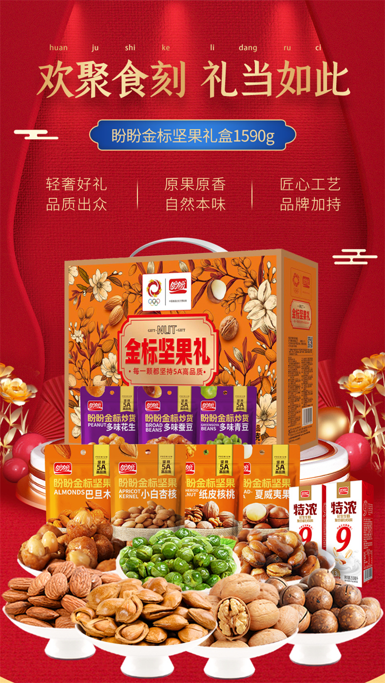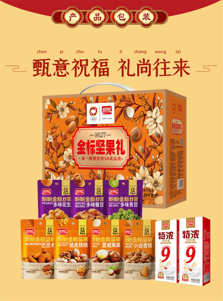 商品名称:盼盼优享款金标坚果零食礼盒1090g+500ml