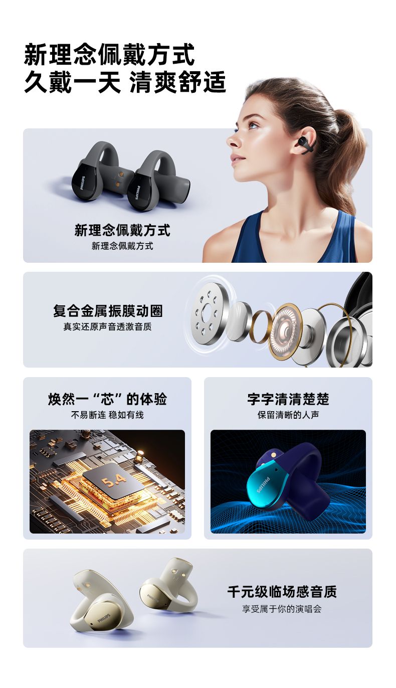 飞利浦(PHILIPS)真无线 蓝牙耳机 开放式挂耳式耳夹式高端运动通话降噪耳机TAT2719