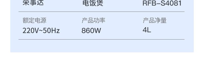 商品名称:荣事达(Royalstar)智能电饭煲4L RFB-S4081