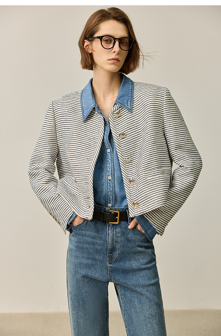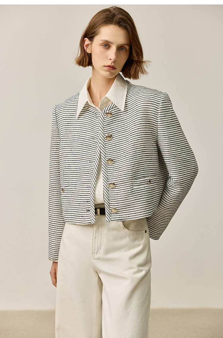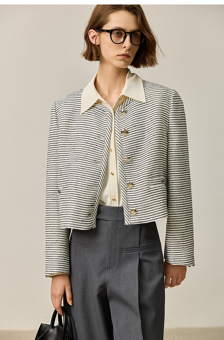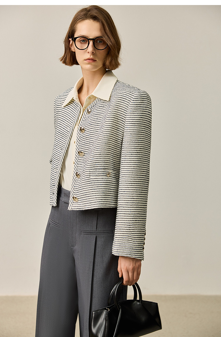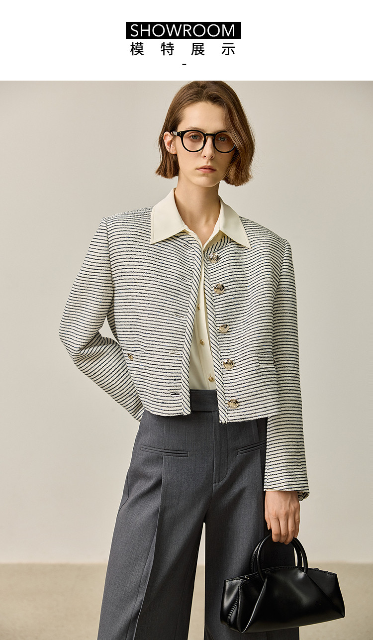 商品名称:春季外套女时尚小香风复古条纹都市通勤款短外套小个子女 172827
