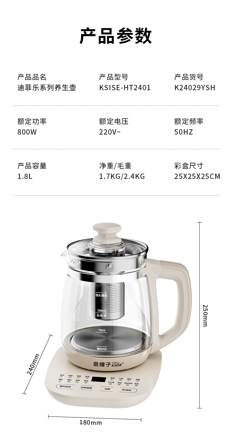 商品名称:KSISE/金嫂子迪菲乐系列1.8升养生壶KSISE-HT2401