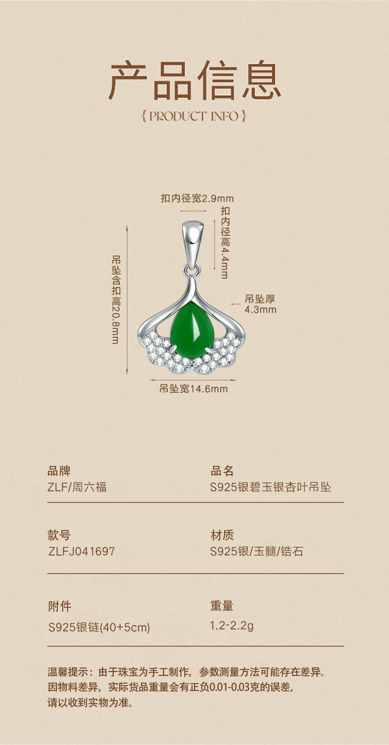 商品名称:周六福S925银碧玉银杏叶项链ZLFJ041698