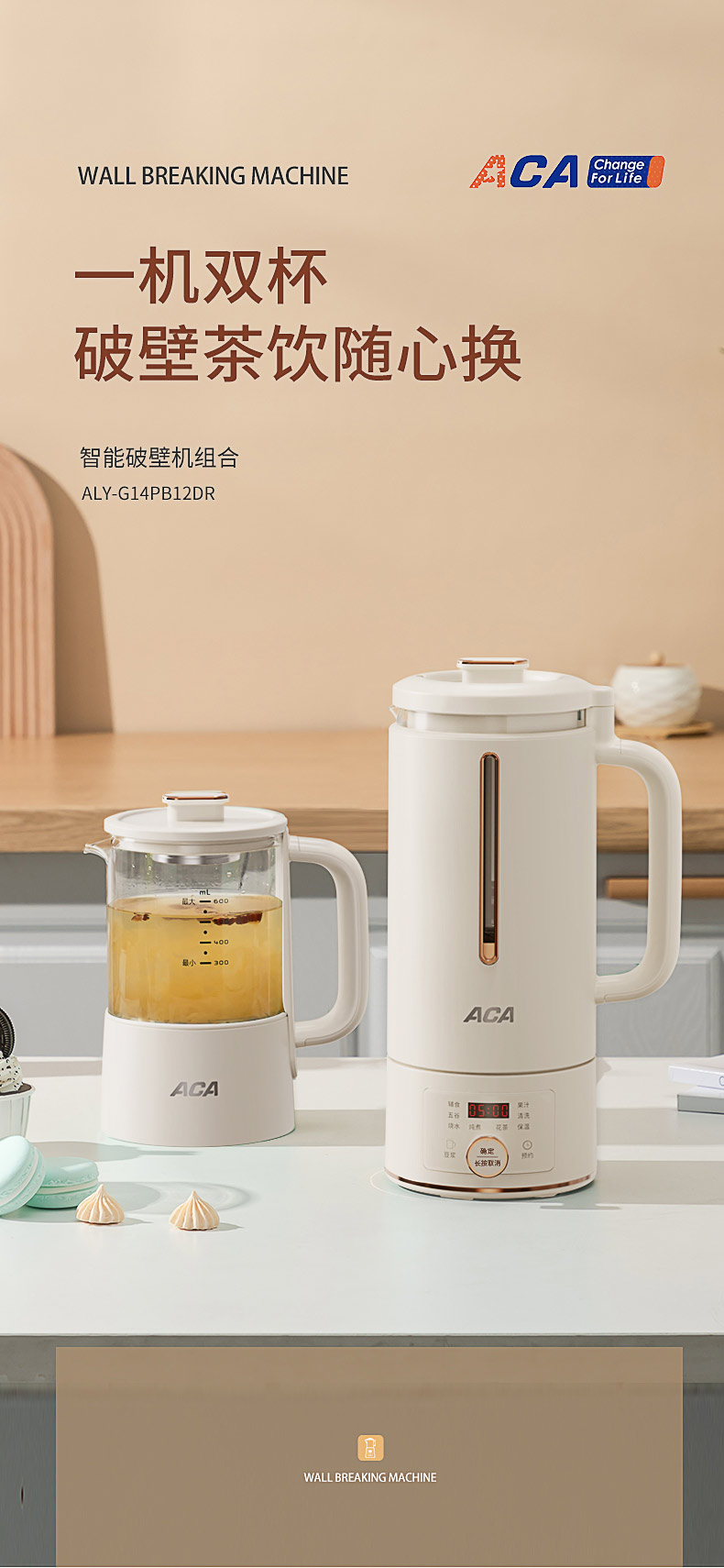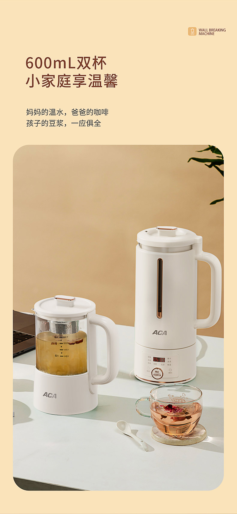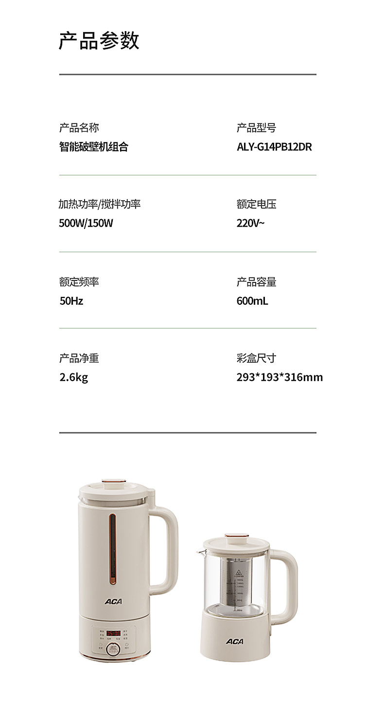 ACA/北美电器600毫升一机双杯破壁机组合ALY-G14PB12DR