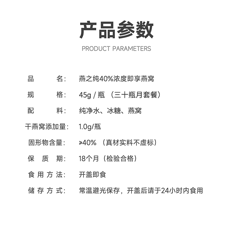 商品名称:燕之纯40%浓度即享燕窝月套餐45g*30瓶装