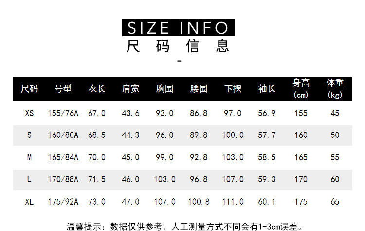 | 尺码 | 衣长(cm) | 肩宽(cm) | 腰围(cm) | 袖长(cm) | 胸围(cm) | 下摆围(cm) | 号型 |