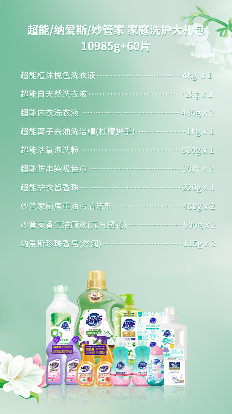 【京东/顺丰配送】超能/纳爱斯/妙管家家庭洗护大礼包10985g+60片