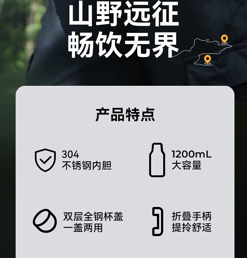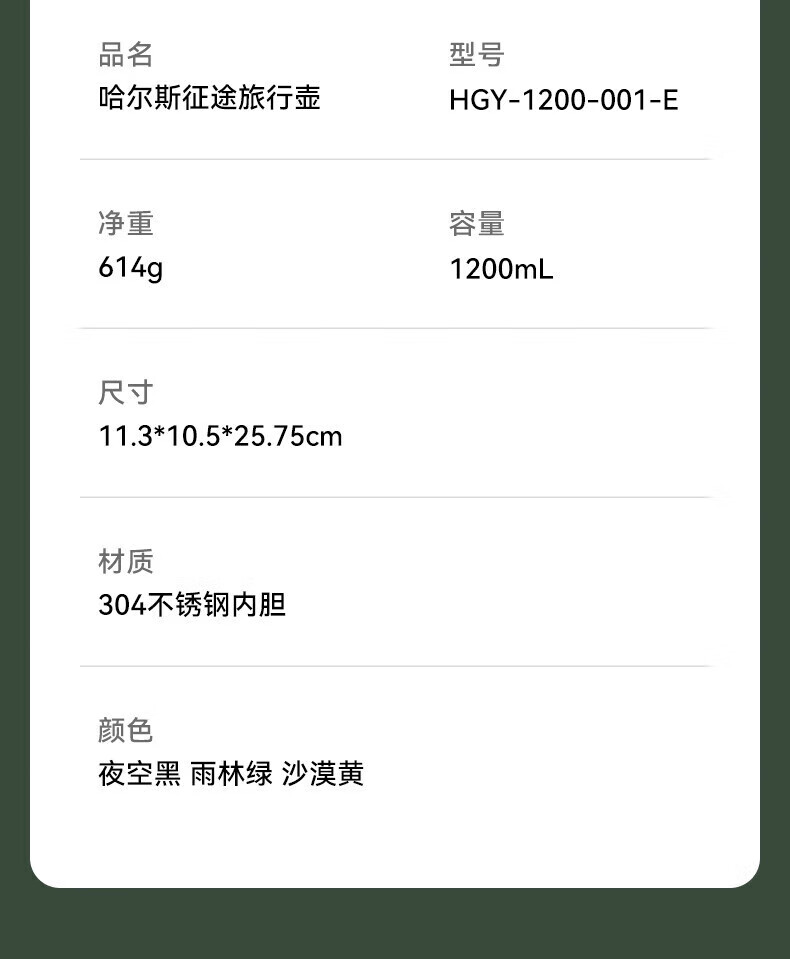 商品名称:HAERS/哈尔斯1200毫升征途旅行壶HGY-1200-001