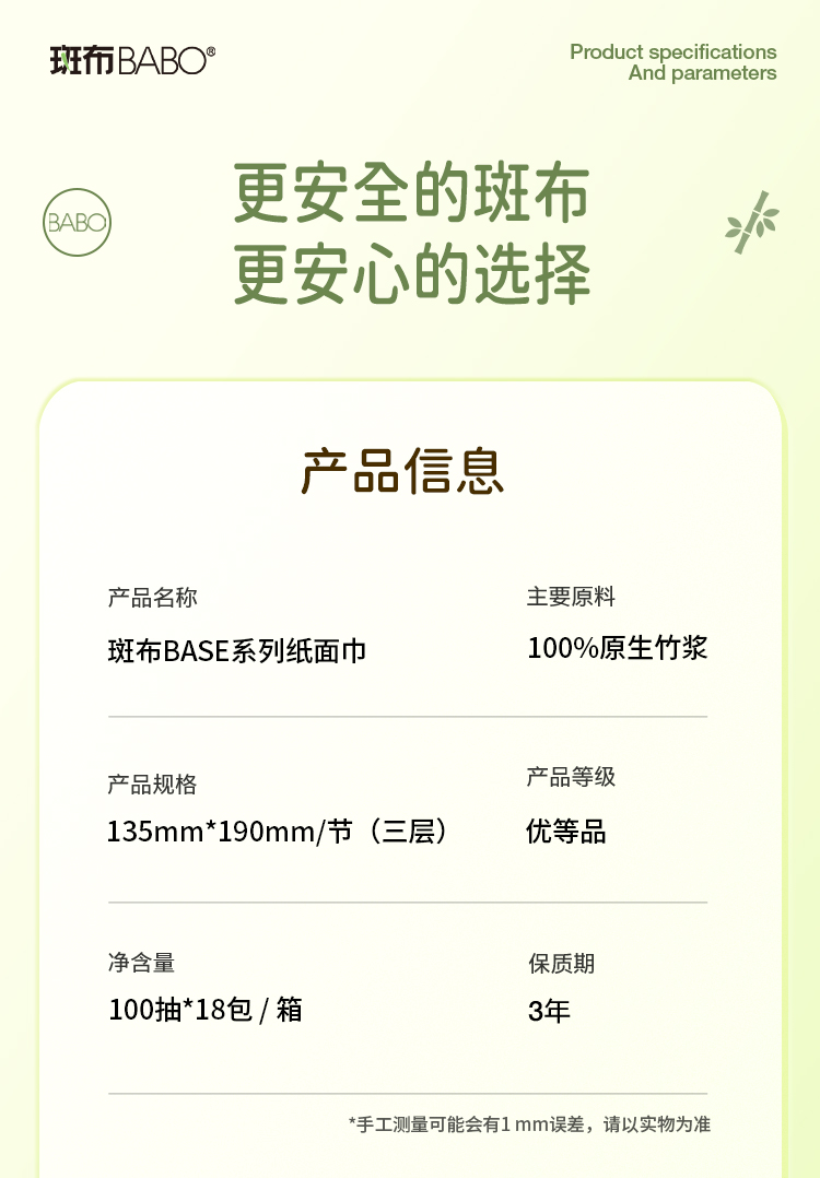 商品名称:BABO/斑布BASE系列面巾纸整箱3层100抽*18包DBCR100E18-X 新老包装随机不接受指定