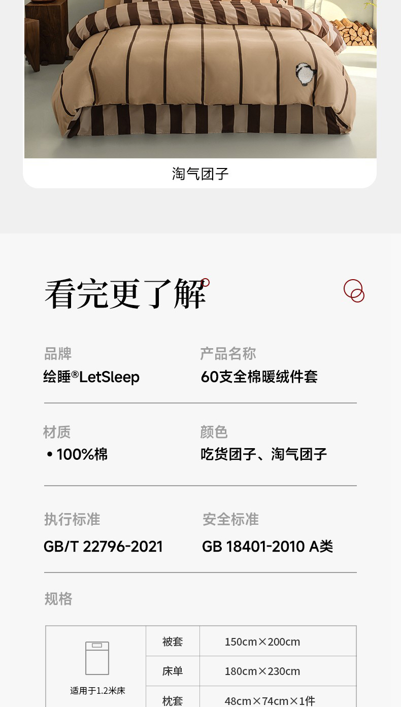 (1.2)被套:150cm*200cm 1件床单:180cm*230cm 1件枕套:48cm*74cm*1件淘气团子-棕色