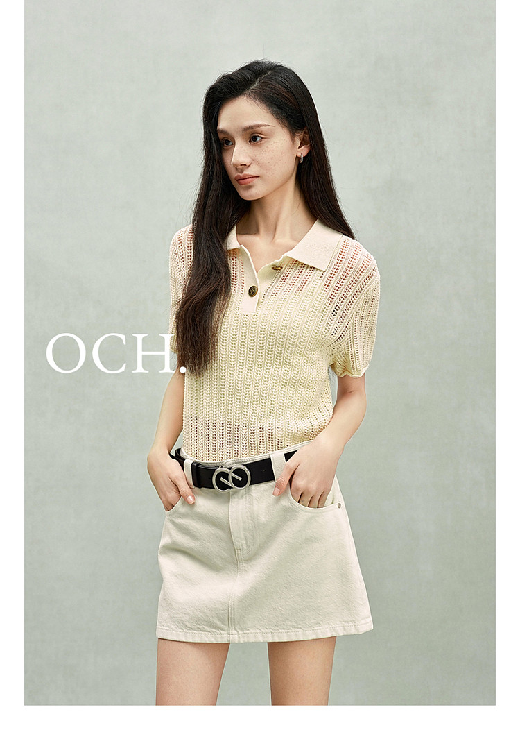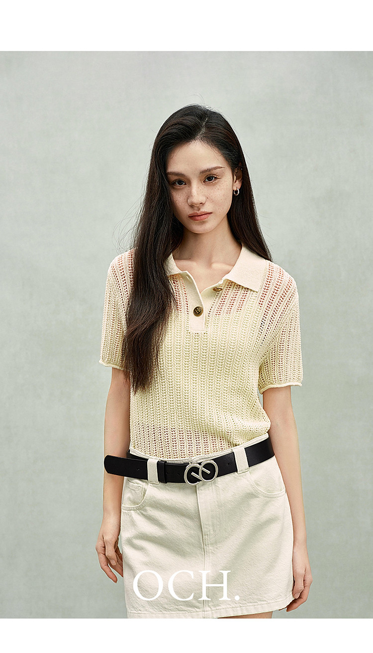 限定系列OCH.春装 亚麻混纺镂空上衣polo领短袖针织衫女 100815