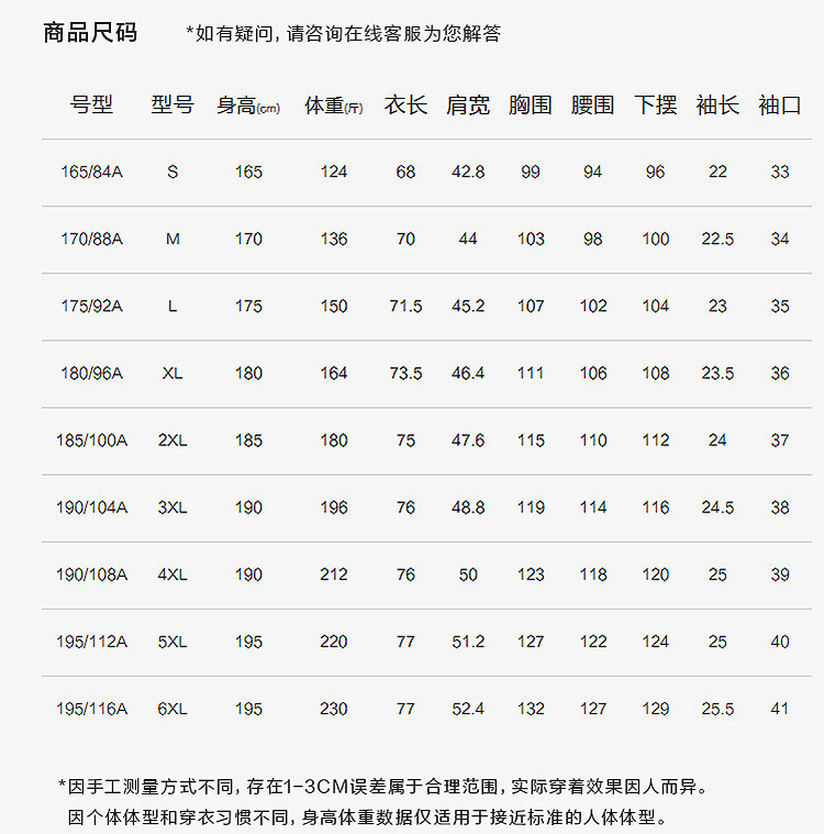 | 4XL(推荐98~106kg) | 76 | 50 | 118 | 25 | 123 | 120 | 190/108A |