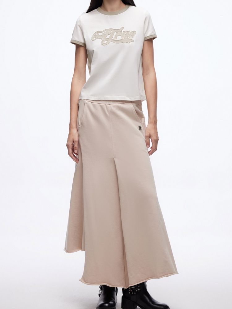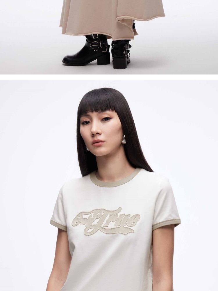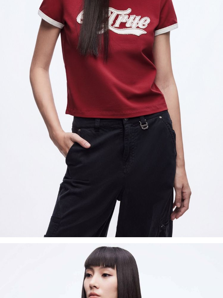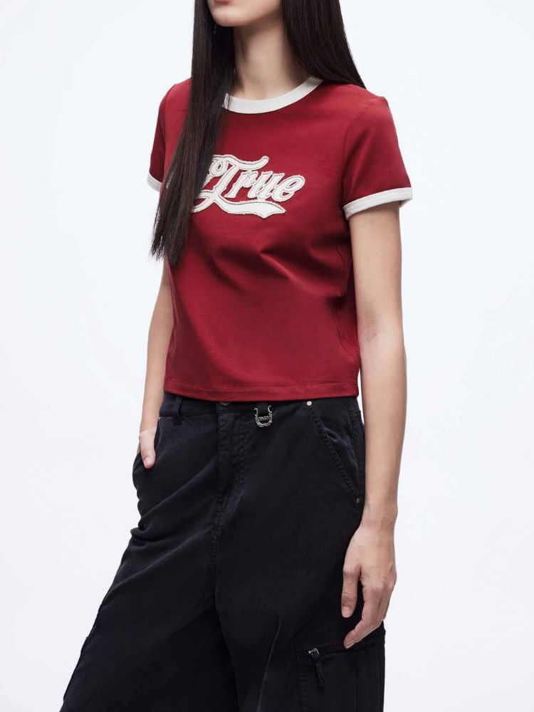 【立体绣布】2025春季复古辣妹修身撞色印花正肩短袖T恤女 485402