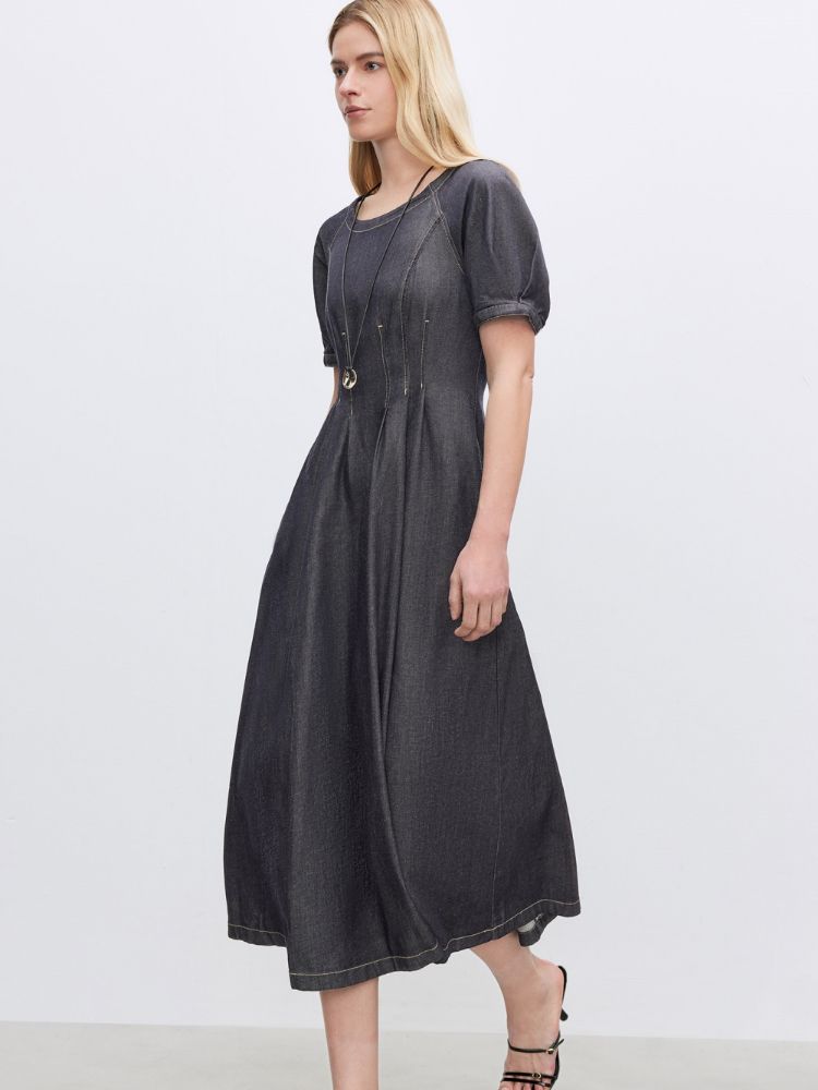 【牛仔连衣裙】2025春季纯色伞裙泡泡袖短袖长裙连衣裙女 055066