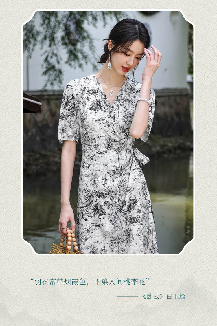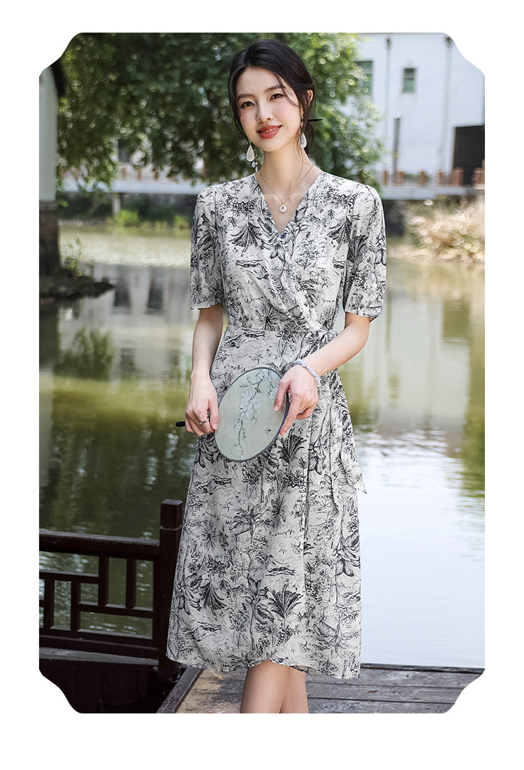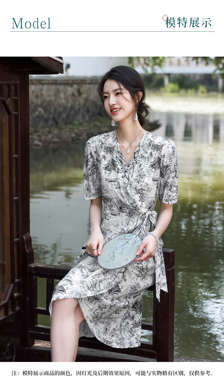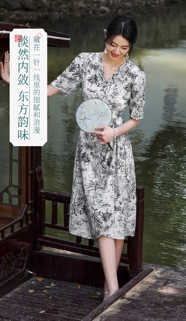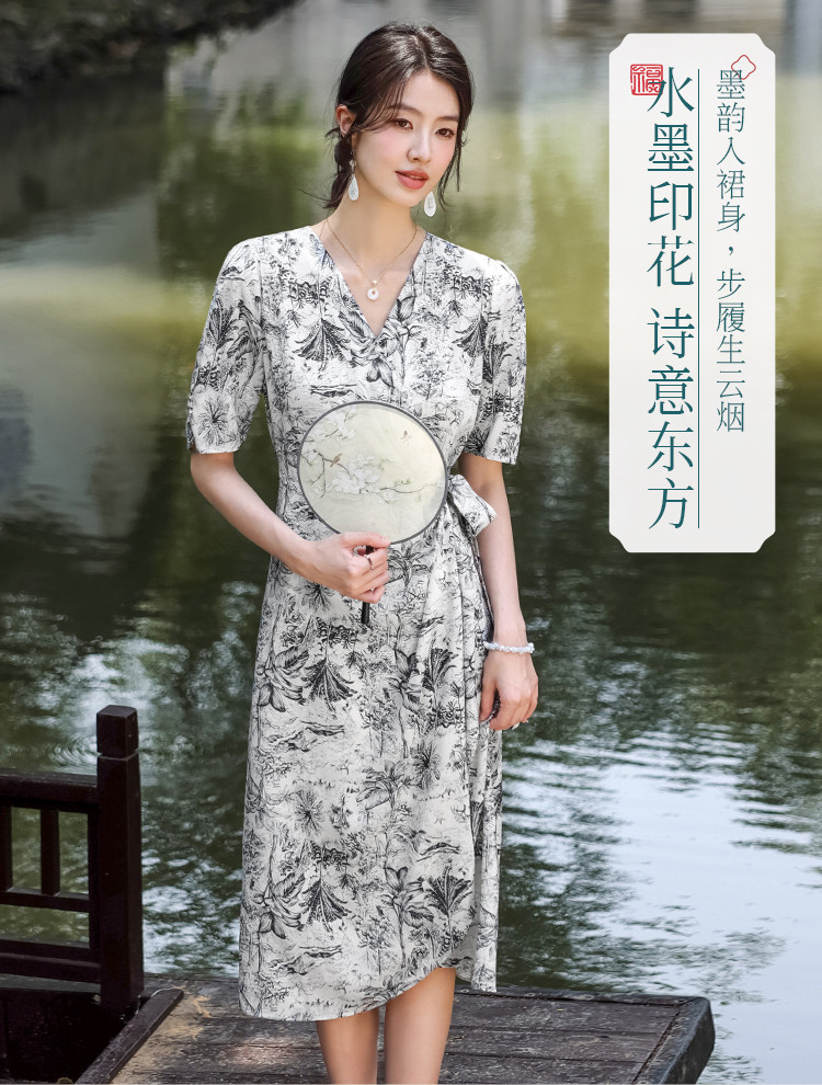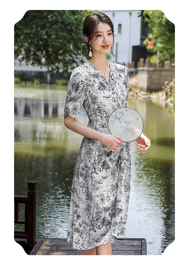 商品名称:100%桑蚕丝V领国风水墨印花真丝连衣裙长裙高级感显瘦直筒裙 640595