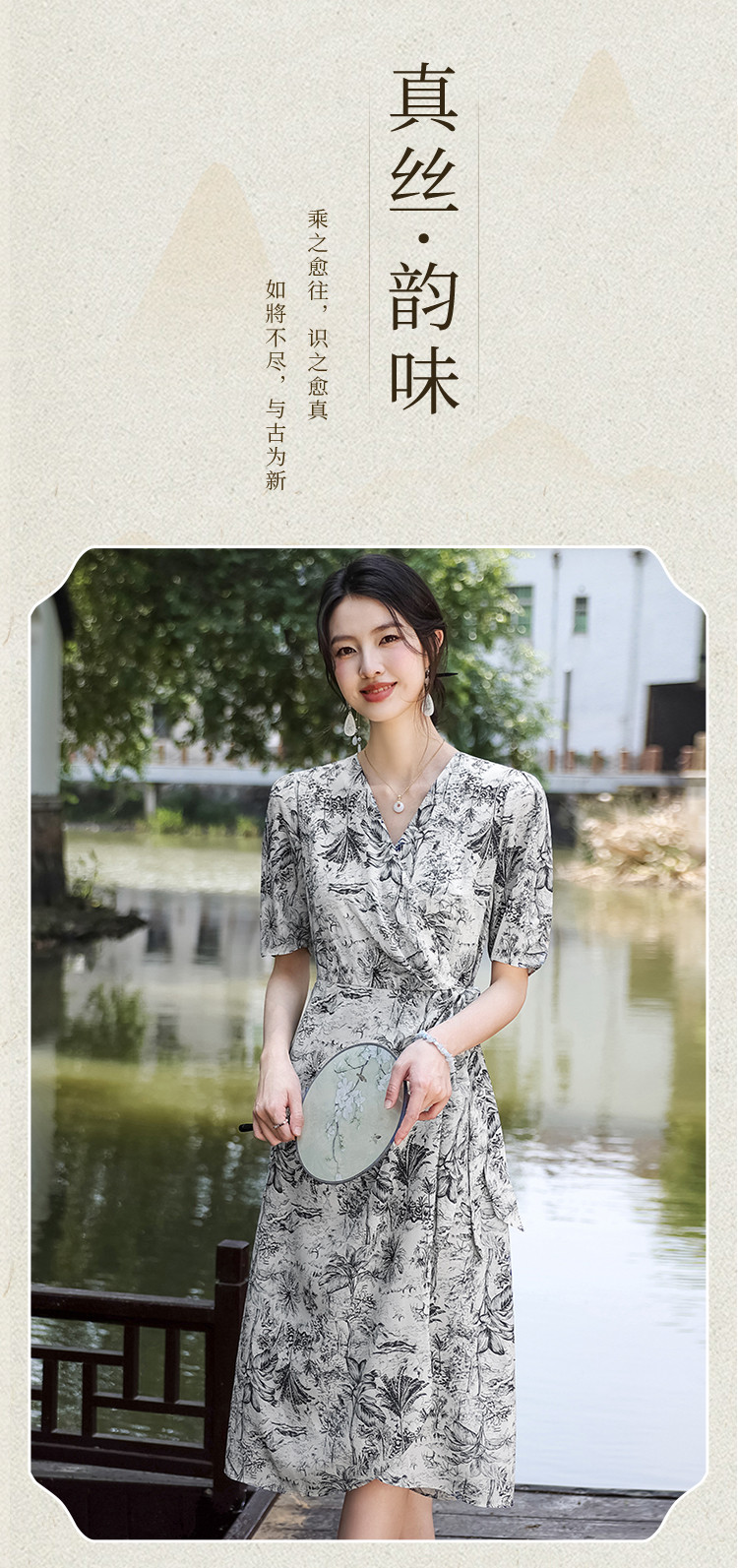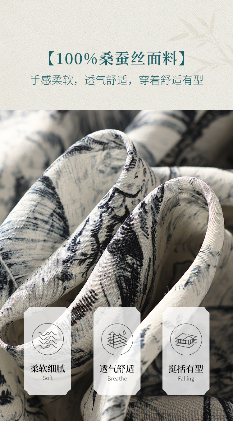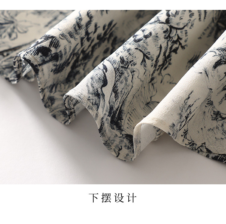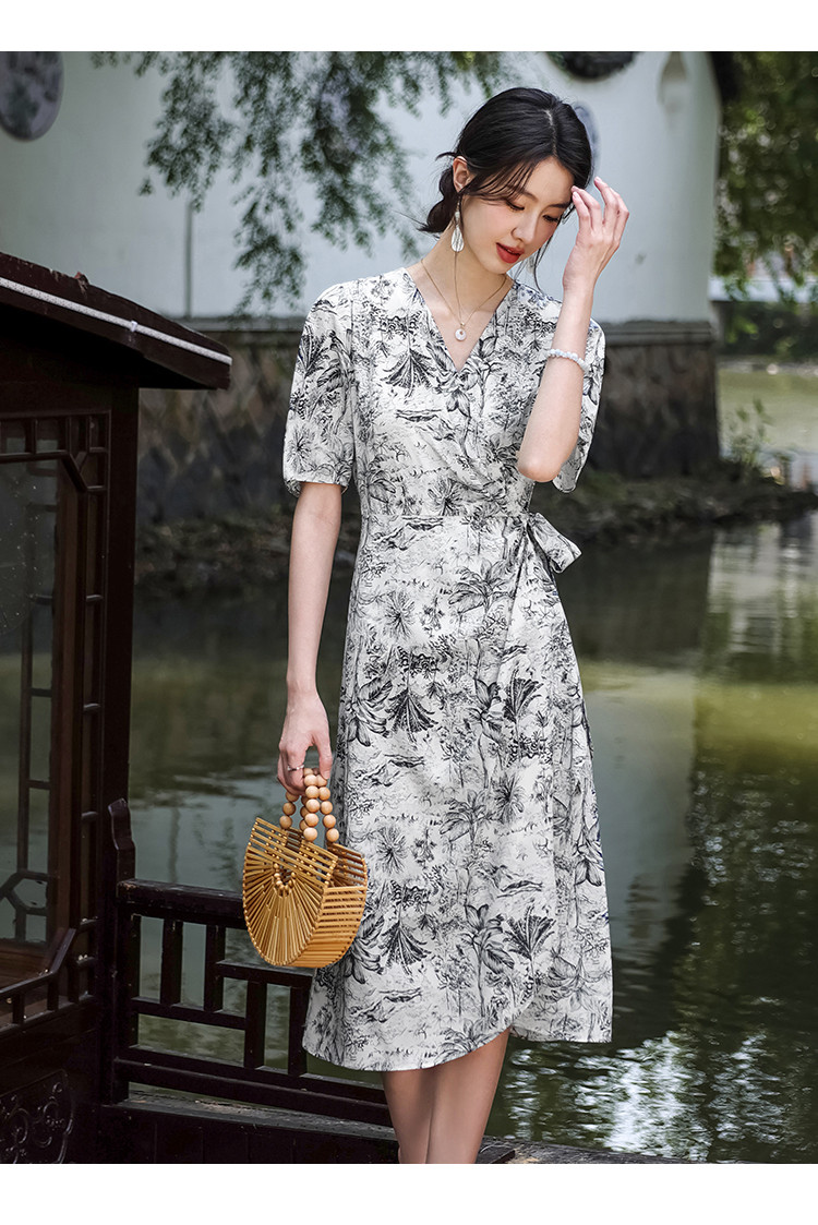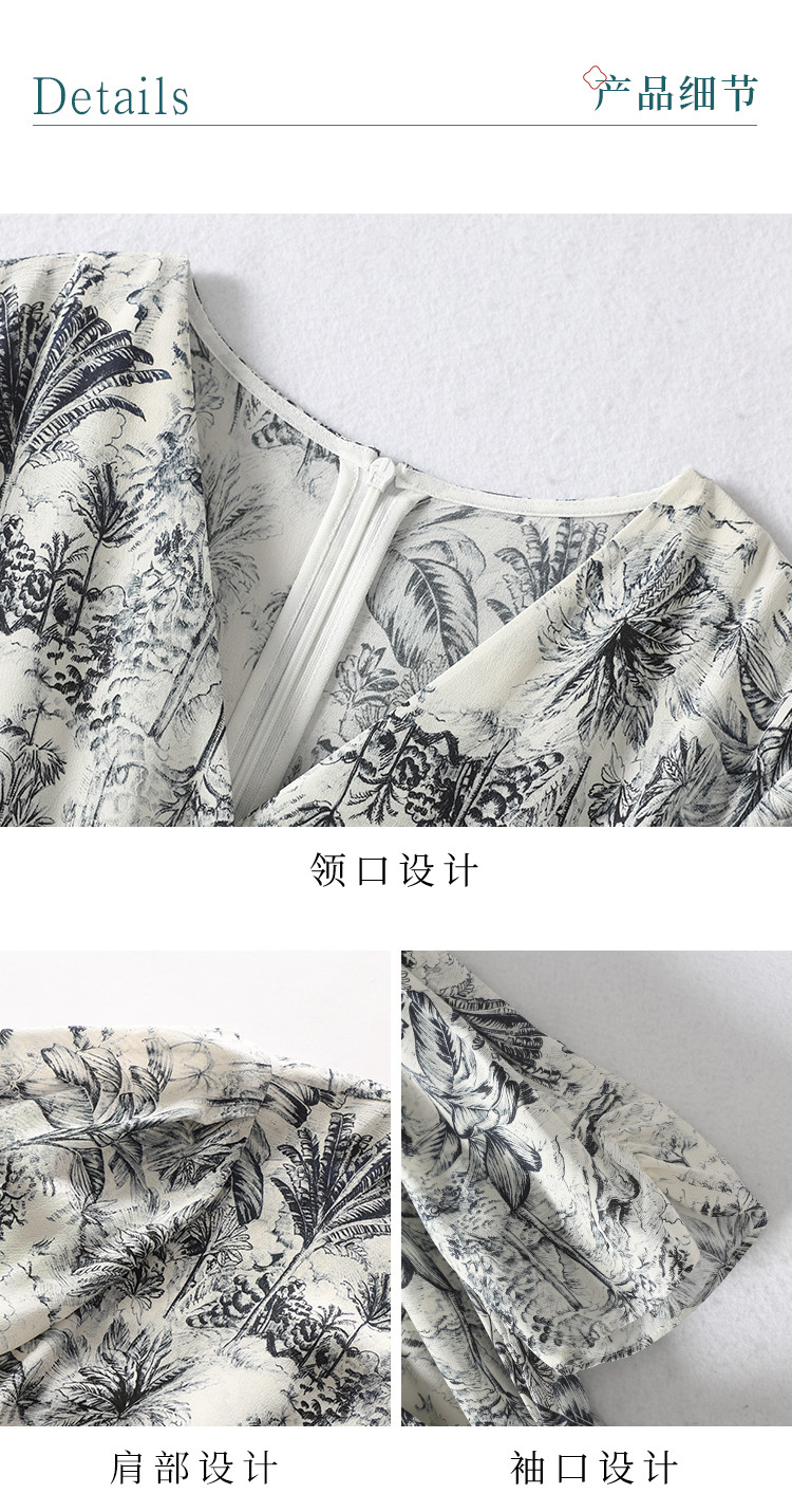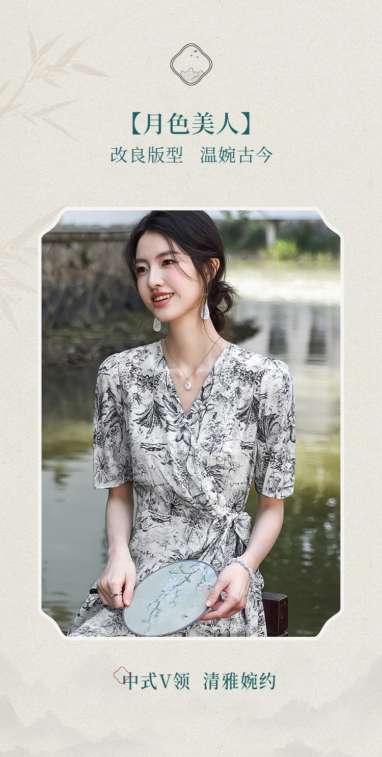 商品名称:100%桑蚕丝V领国风水墨印花真丝连衣裙长裙高级感显瘦直筒裙 640595
