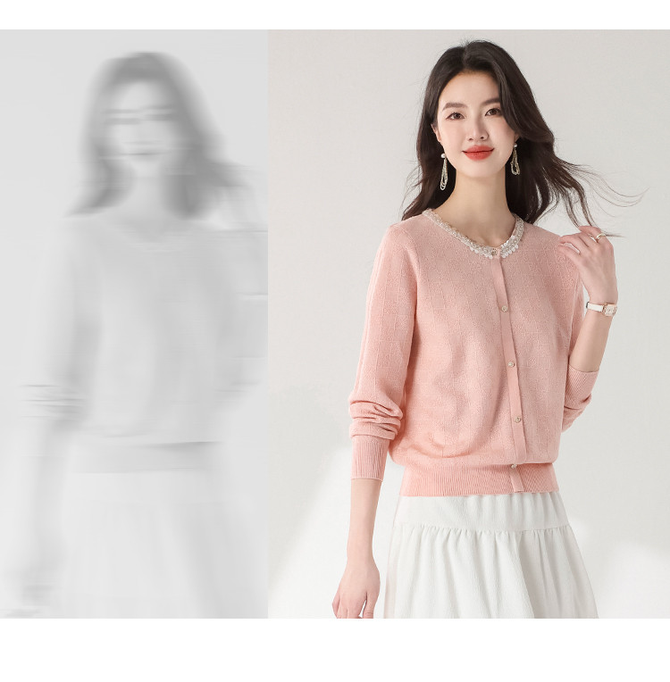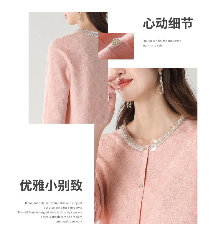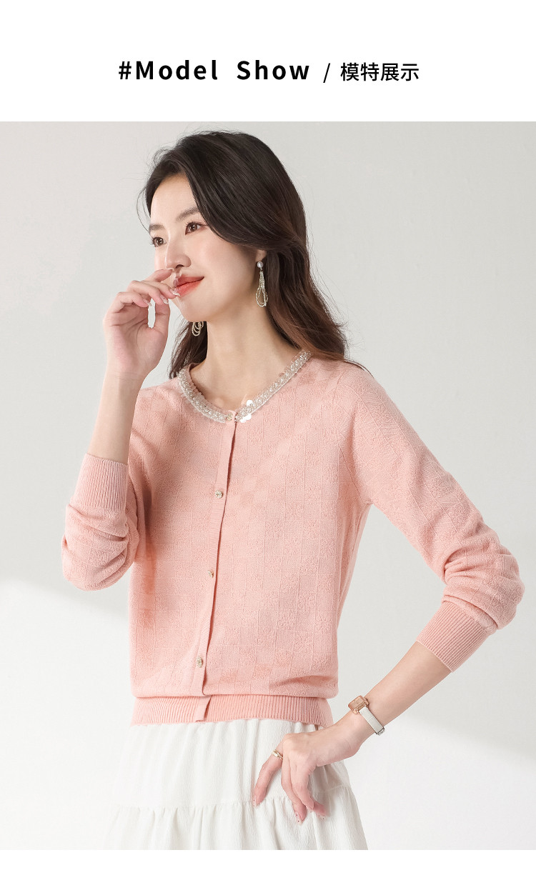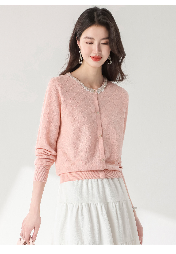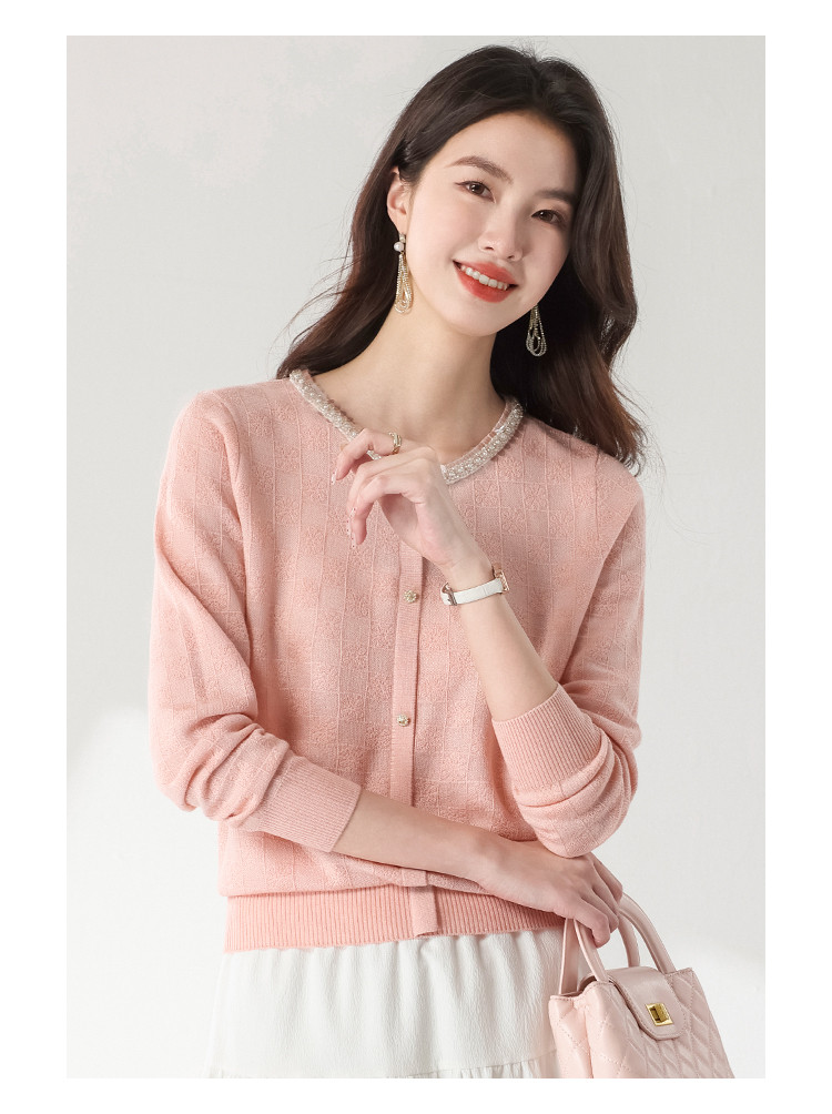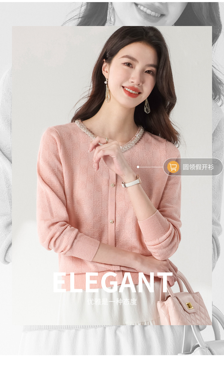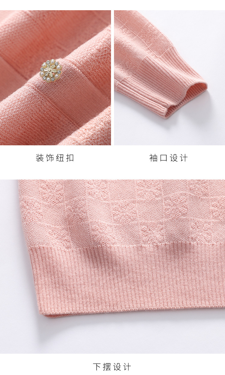 商品名称:圆领纯色方格针织衫女开衫含羊羊毛休闲毛衣外套春装薄款上衣 417363
