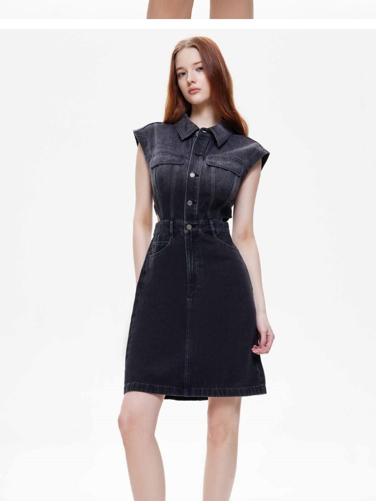 【侧腰镂空】2025夏季单排扣口袋收腰翻领短裙牛仔连衣裙女 872922
