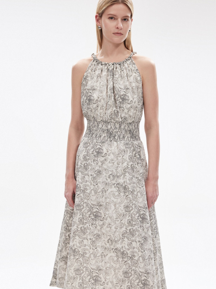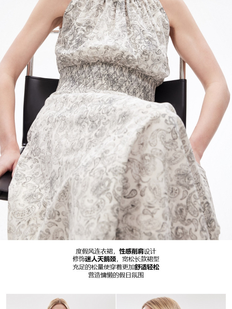【度假风】2025春季印花收腰褶皱显瘦无袖中长裙连衣裙女 724826
