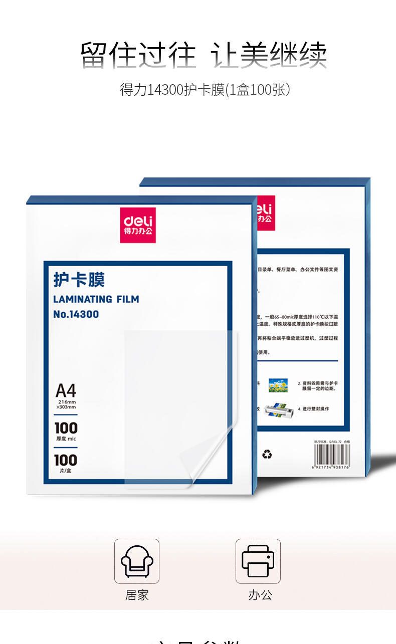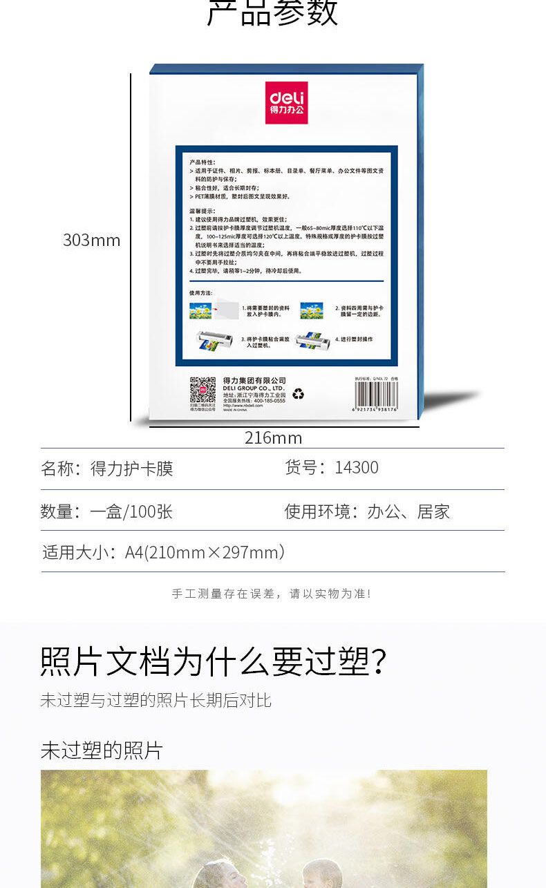 商品名称:得力 14300护卡膜(透明白)(100张/盒)*2盒
