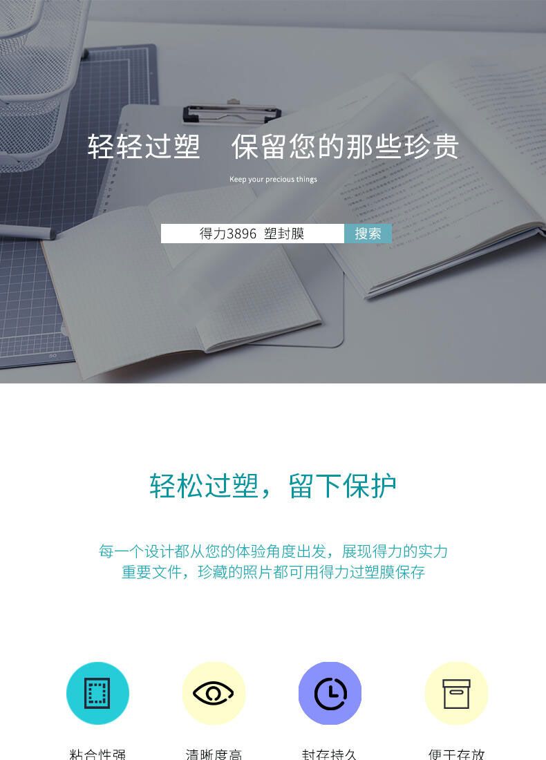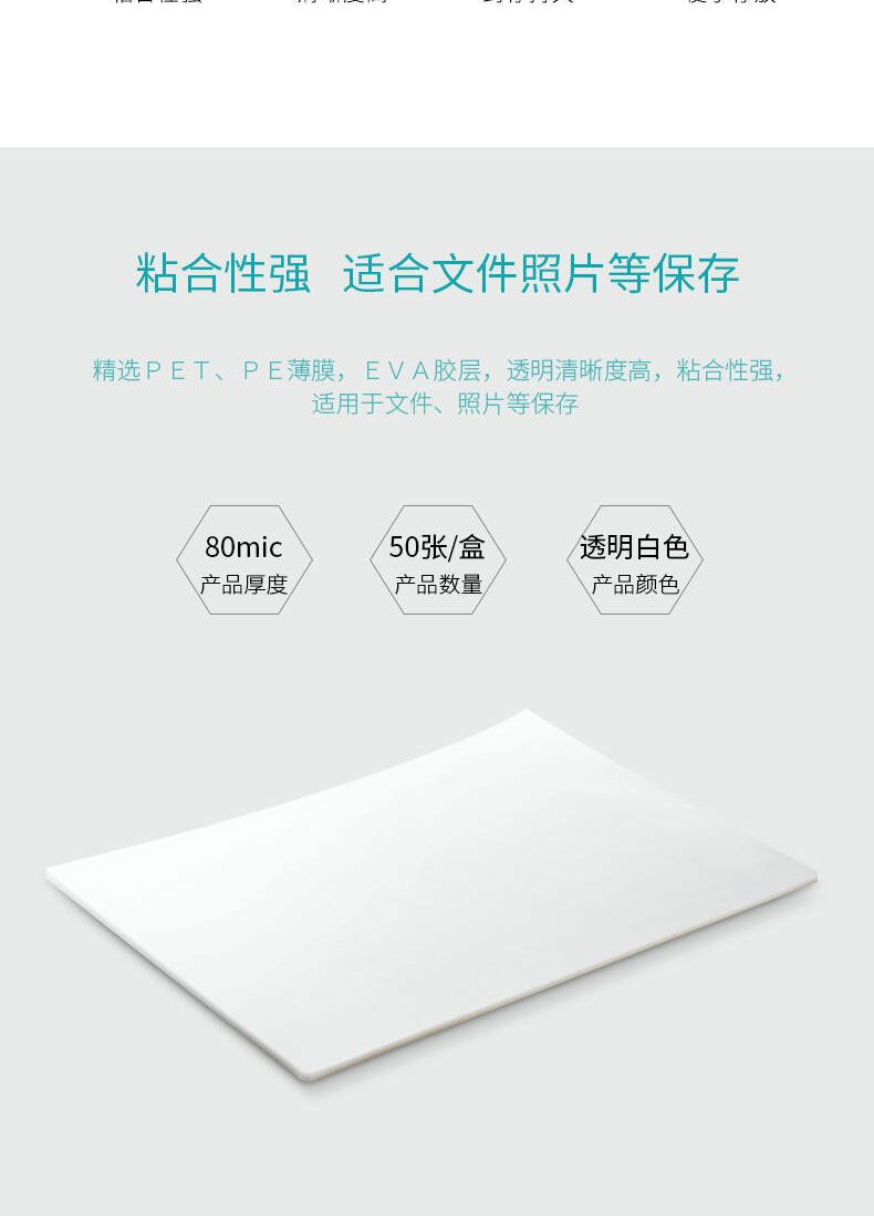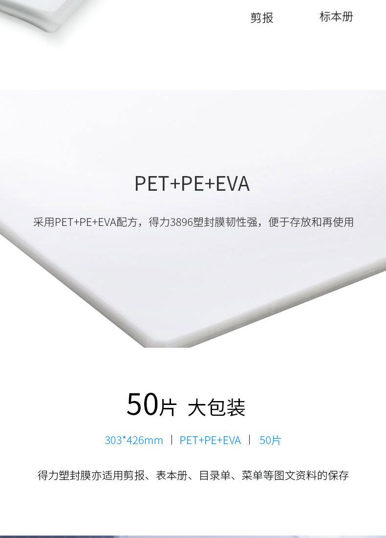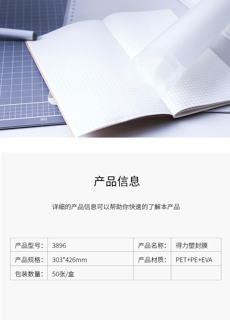 商品名称:得力 3896塑封膜(透明白)(50张/盒)*2盒