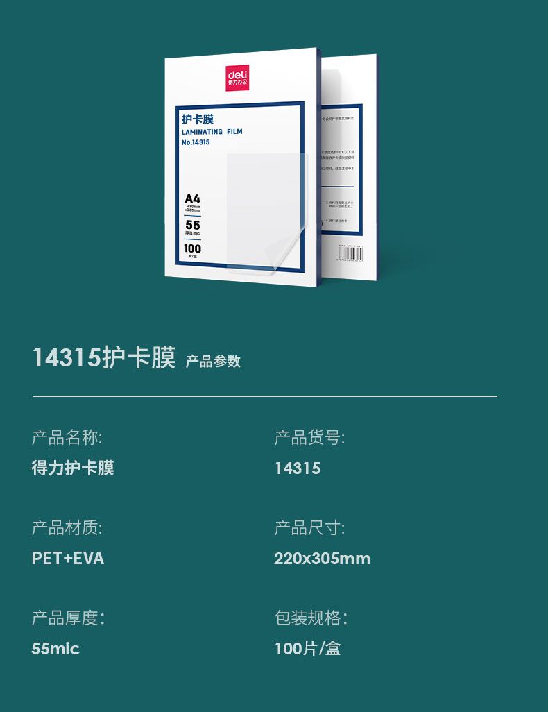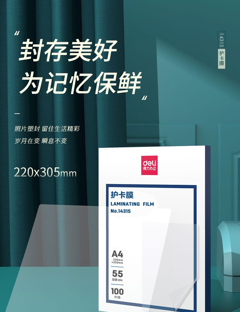商品名称:得力 14315护卡膜(透明白)(100片/盒)*2盒