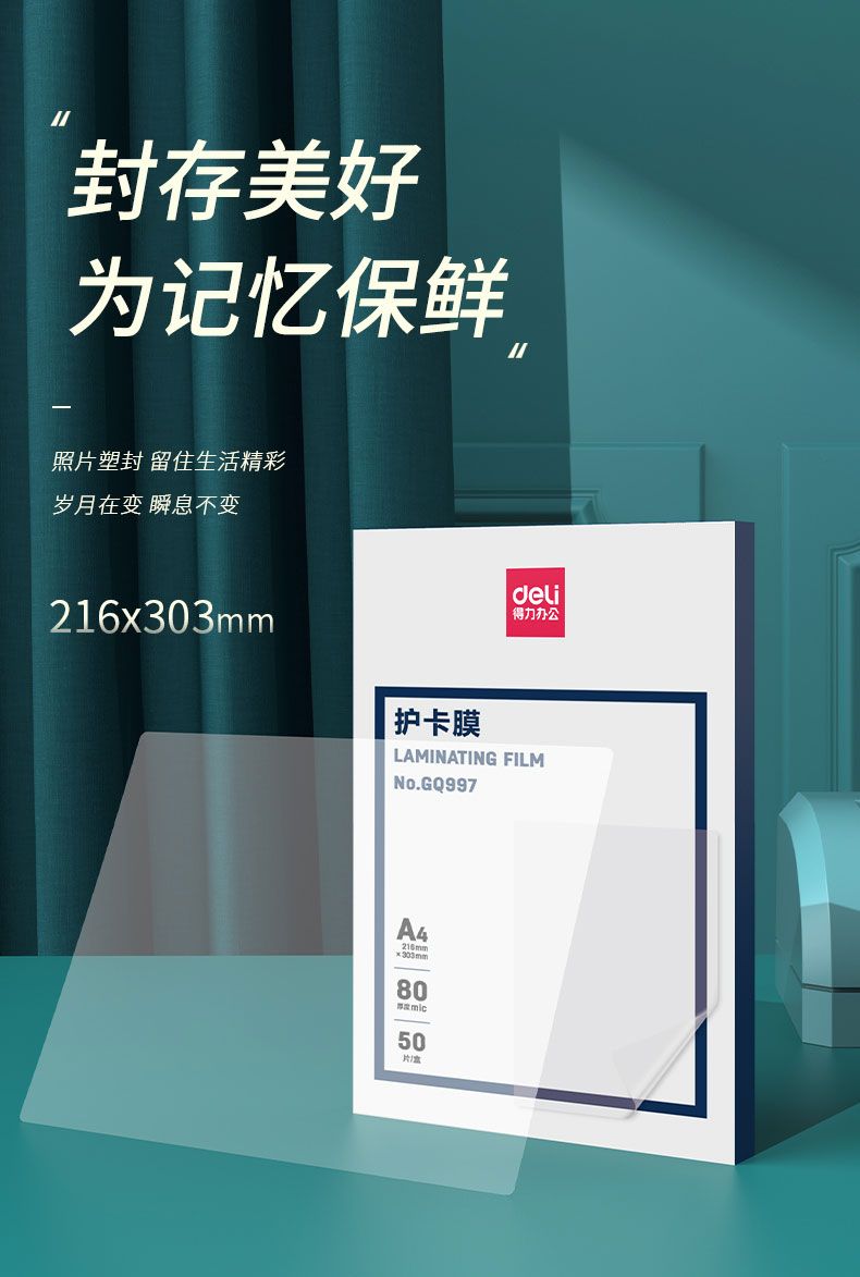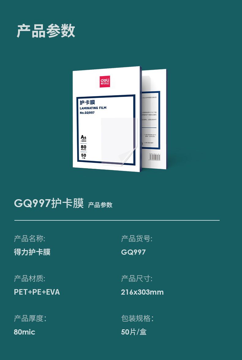 商品名称:得力 GQ997护卡膜(透明白)(50片/盒)*3盒