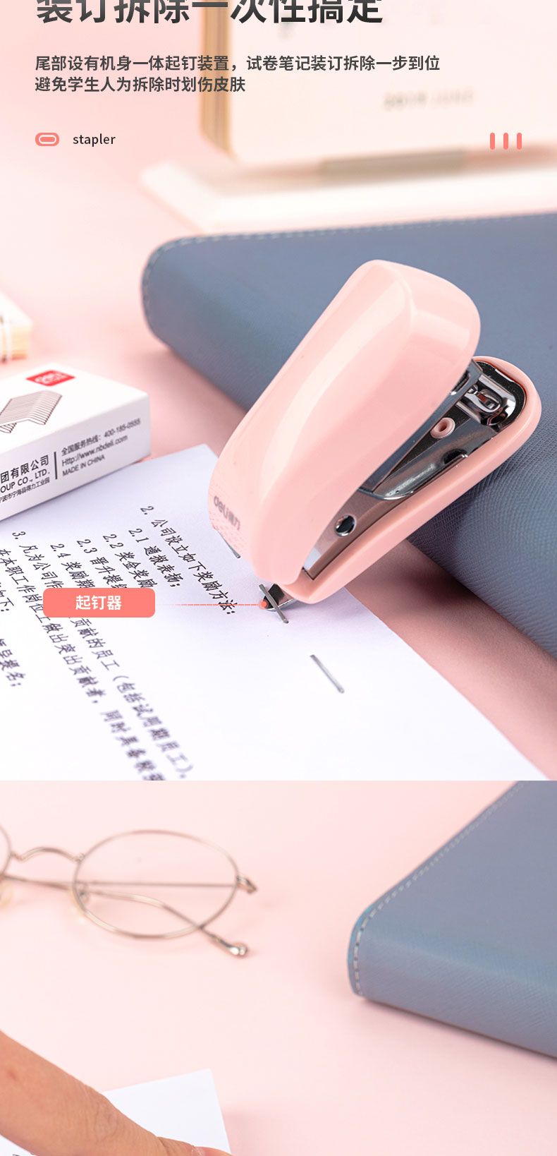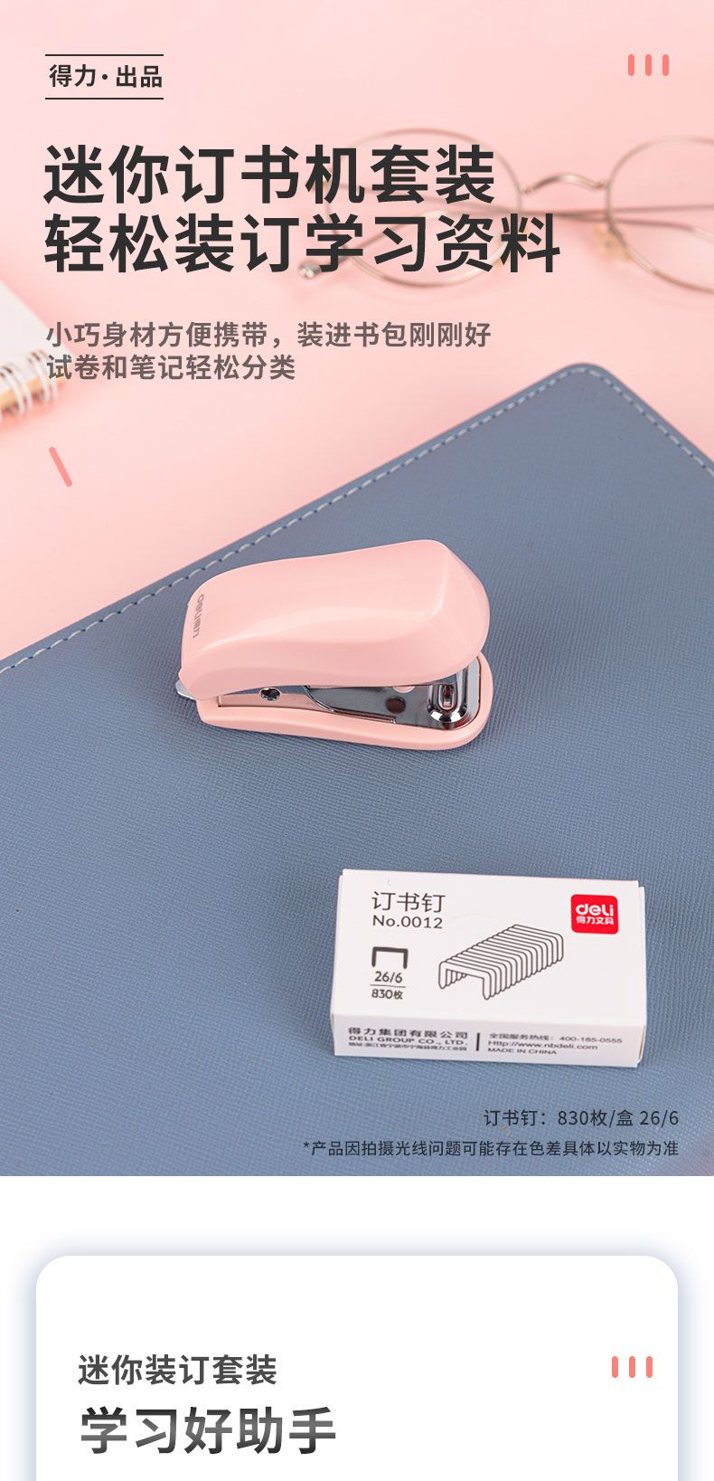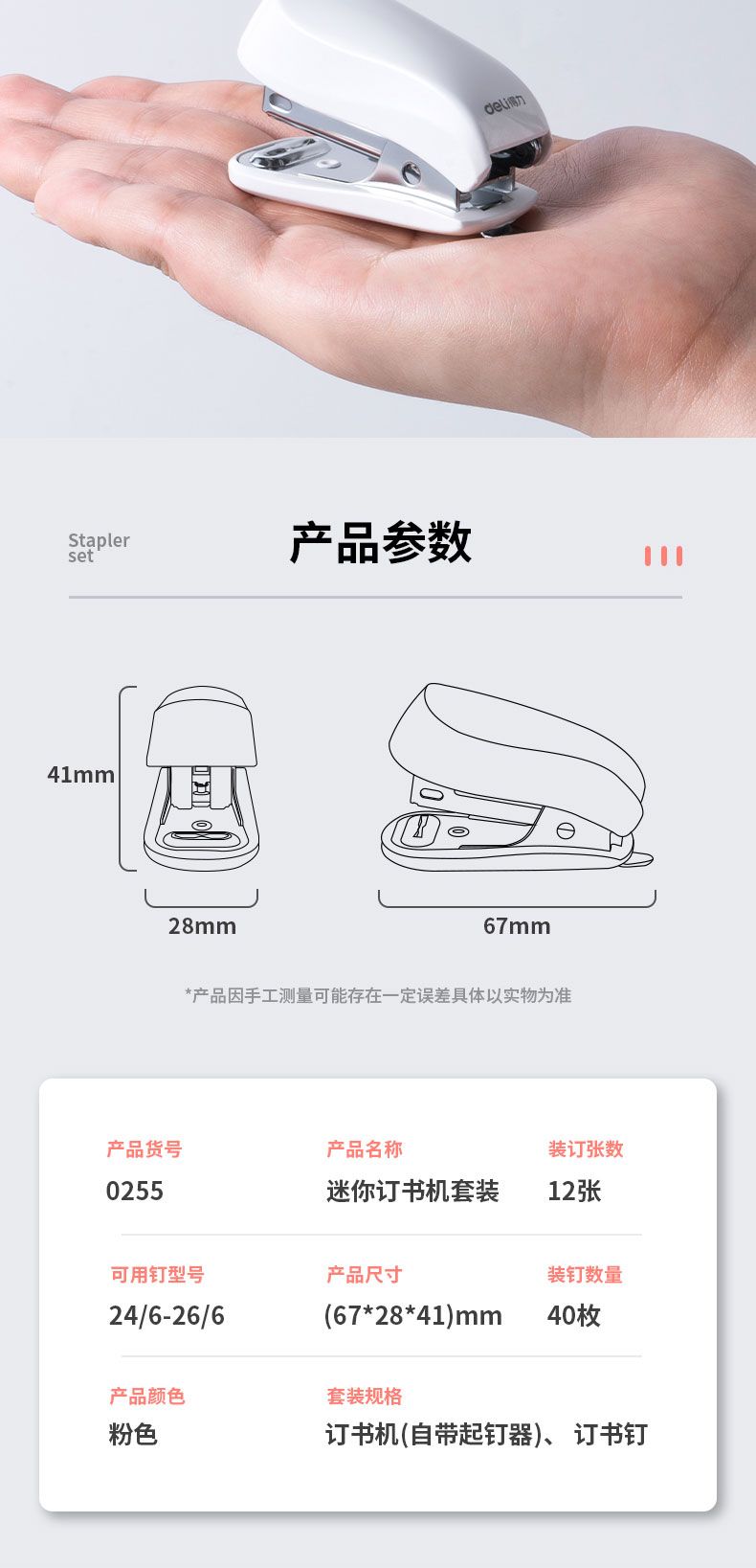 商品名称:得力 0255迷你订书机套装(粉色)(1订书机+1订书钉/卡)*5套