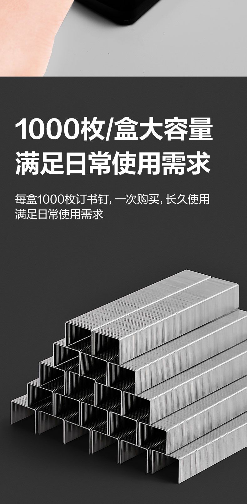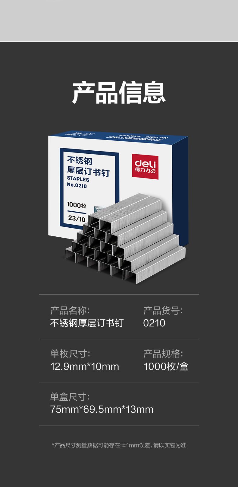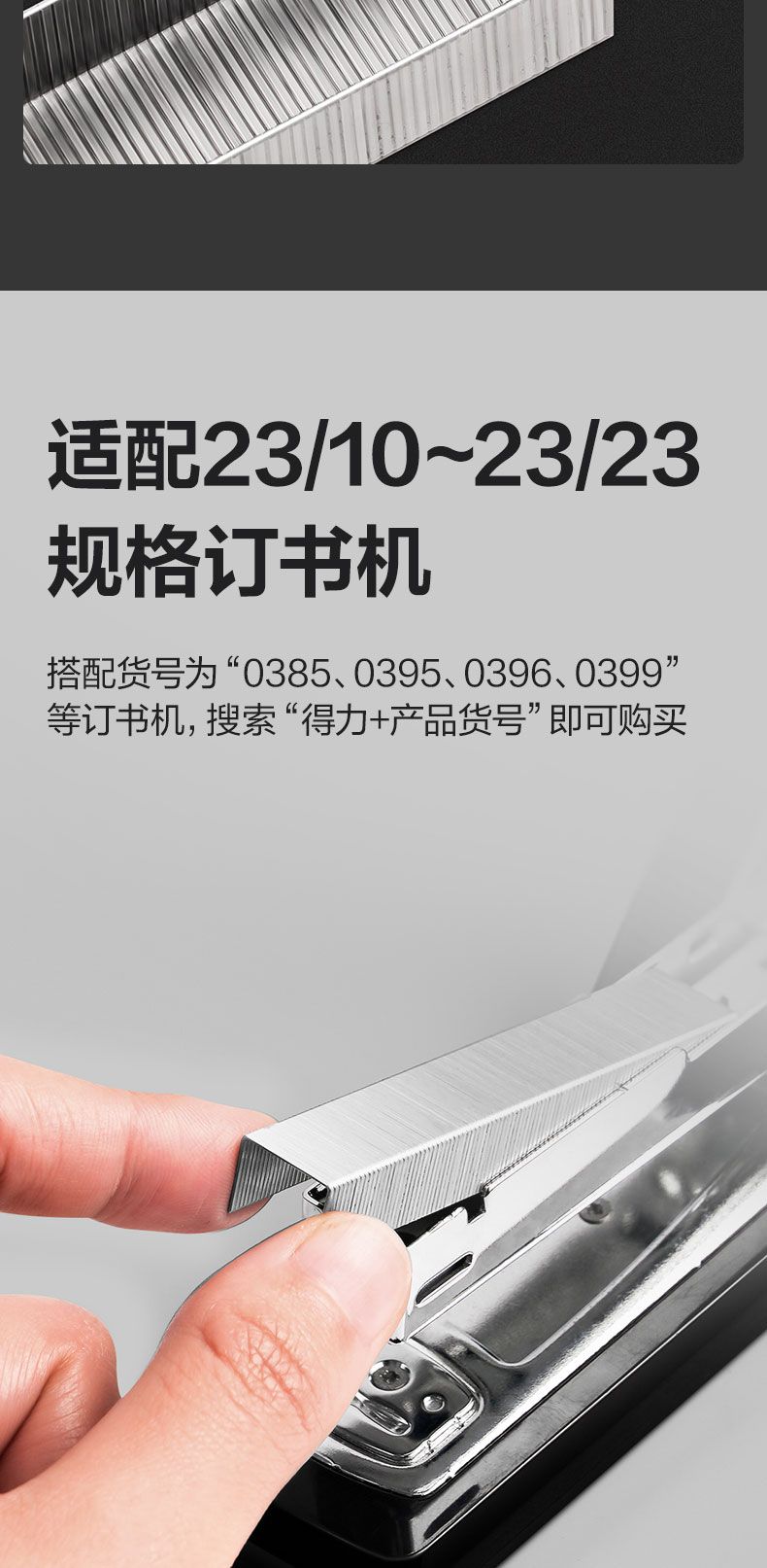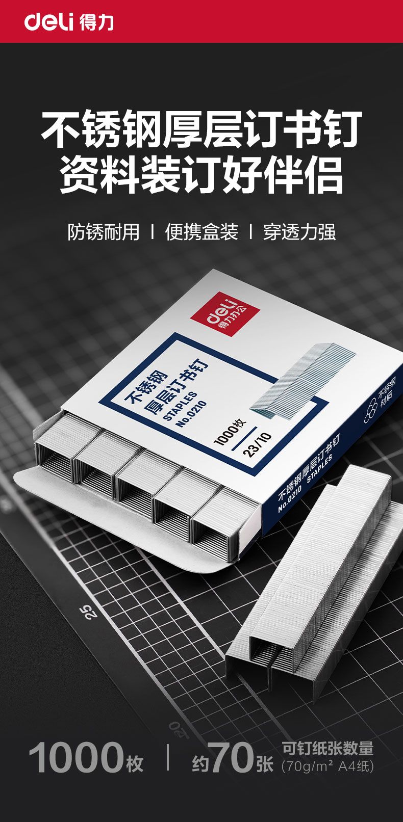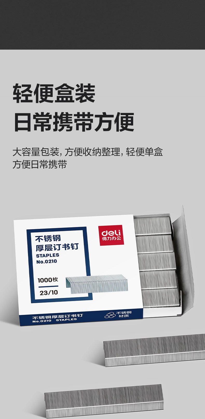 商品名称:得力 0210不锈钢厚层订书针23/10(银)(1000枚/盒)*10盒