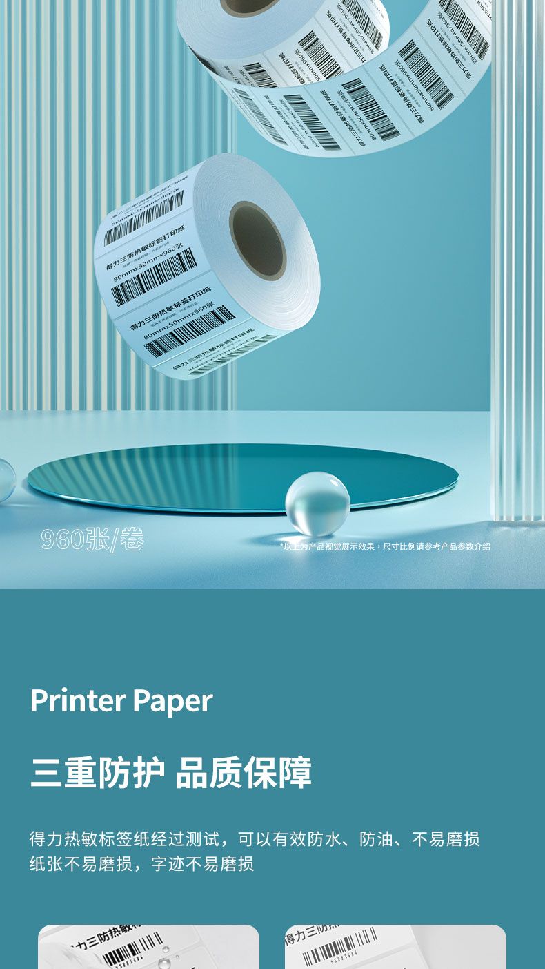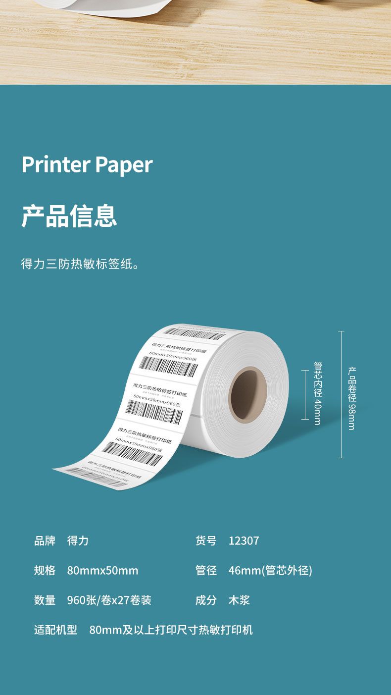 得力 12307塞纳河三防热敏标签纸80*50mm-960枚(白)(1卷/筒)*5筒