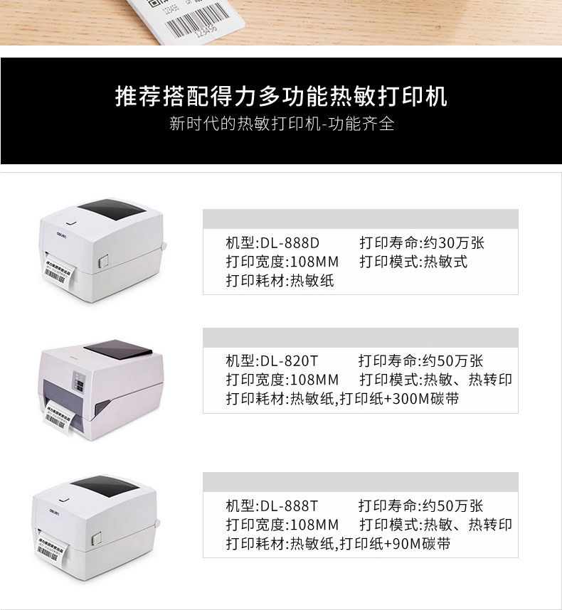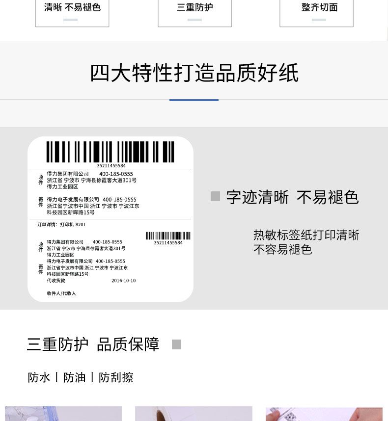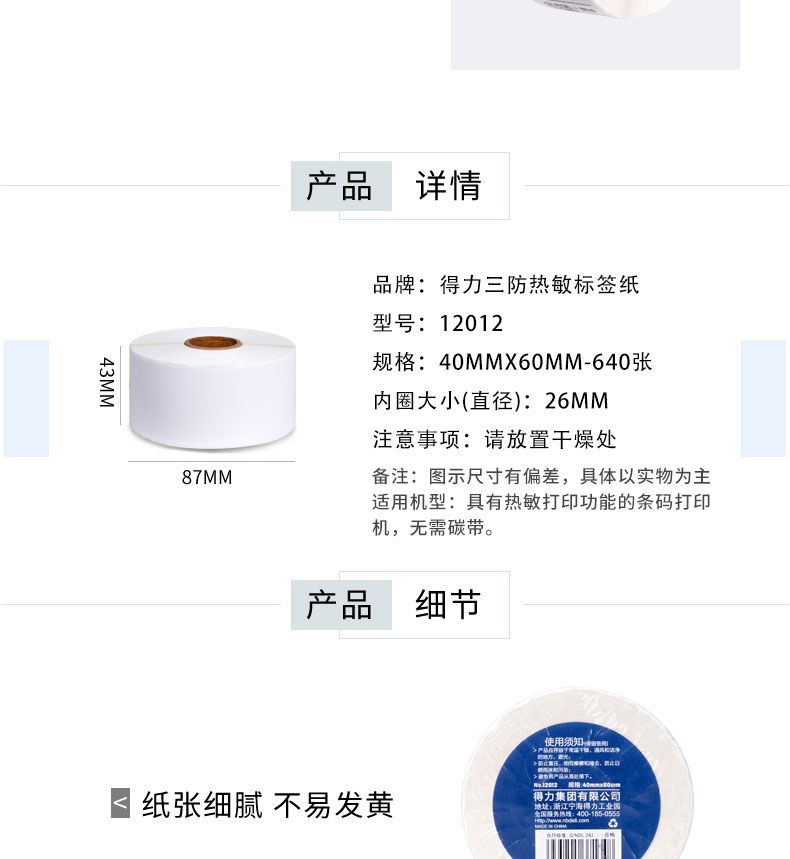 商品名称:得力 12012珊瑚海三防热敏标签纸40*60mm-640枚(白)(2卷/筒)*4筒