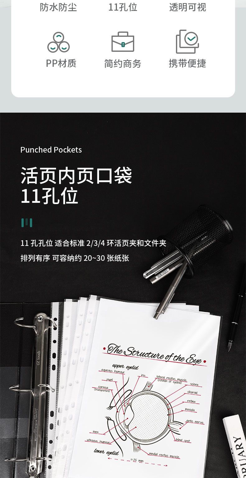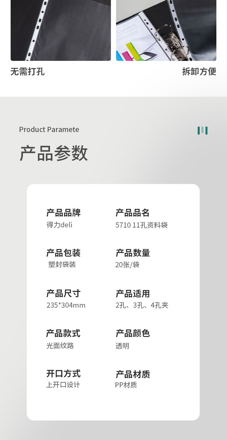 商品名称:得力 5710_11孔资料袋(透明)(20只/包)*10包