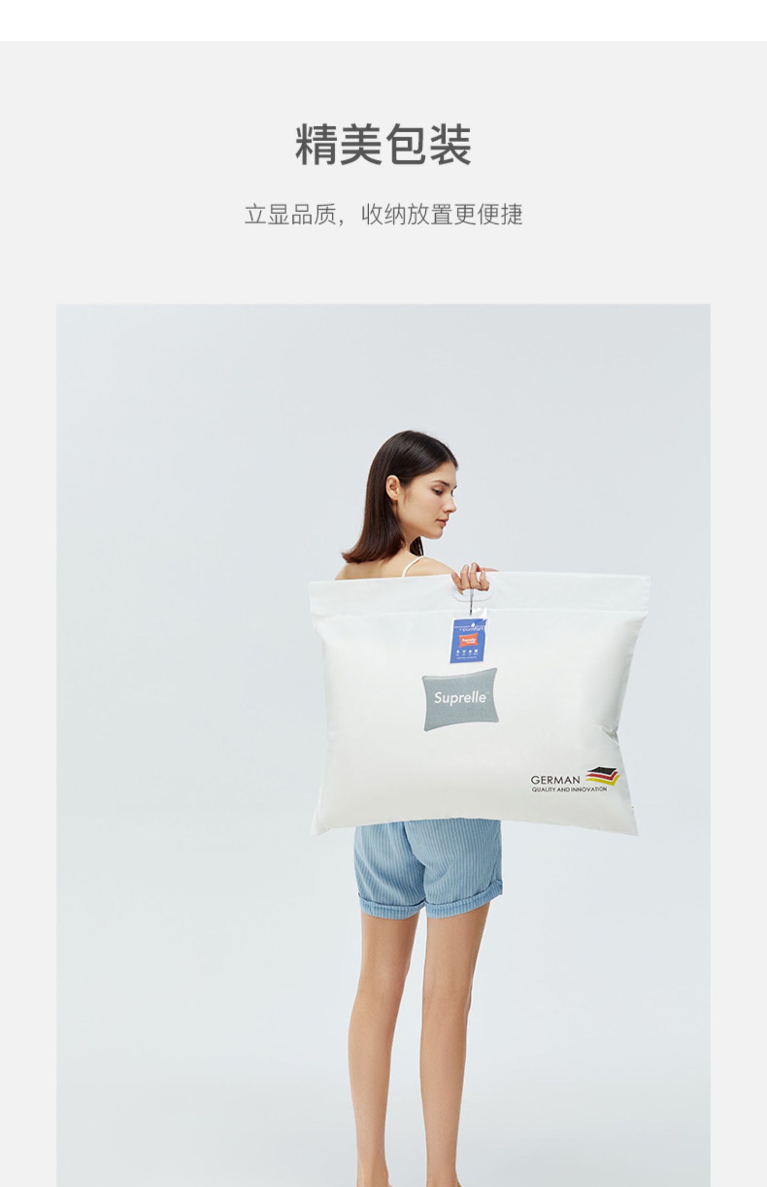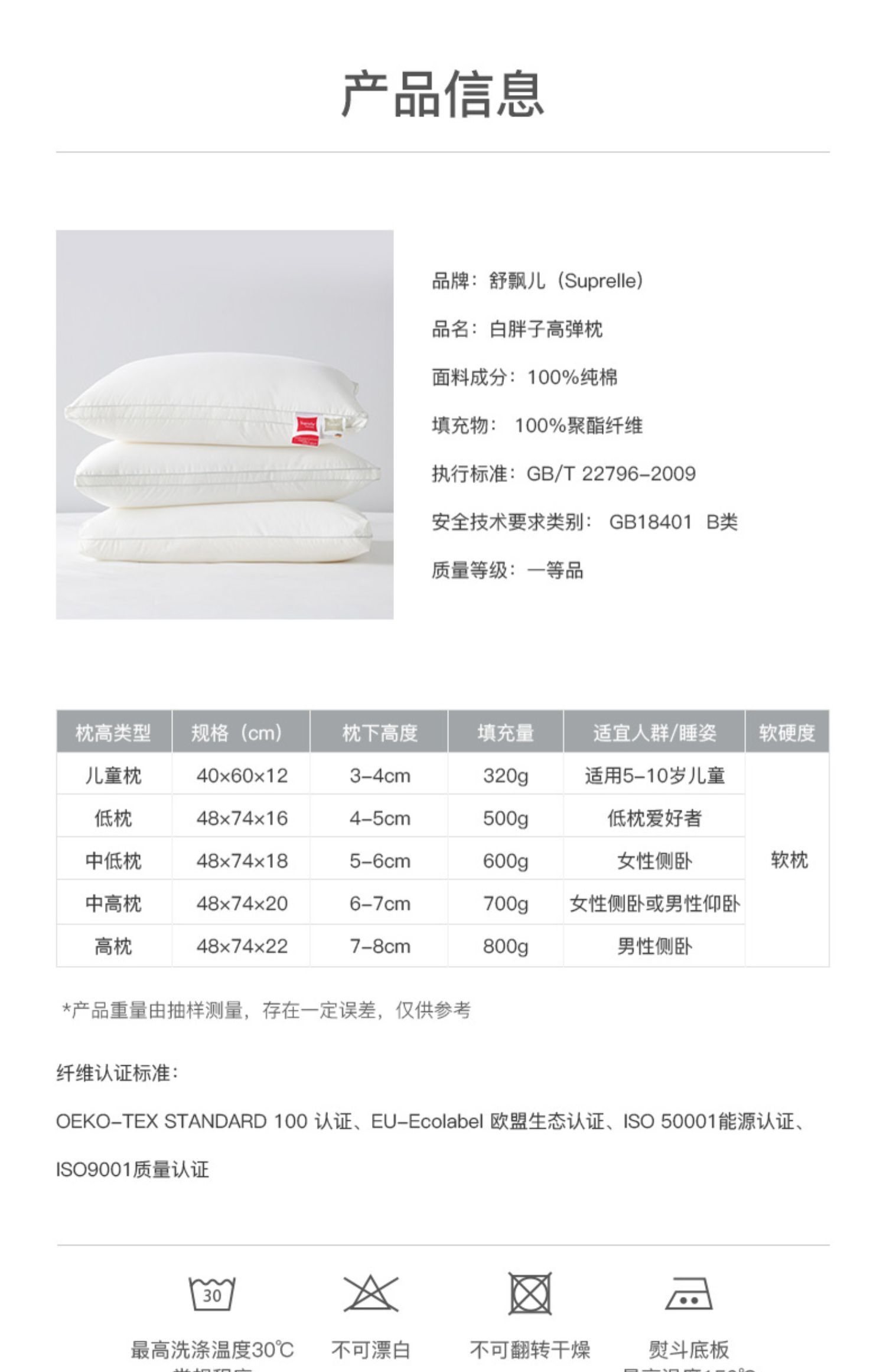商品名称:舒飘儿德国进口高弹枕头芯单人家用纯棉可水洗酒店枕护颈助睡眠48*74cm