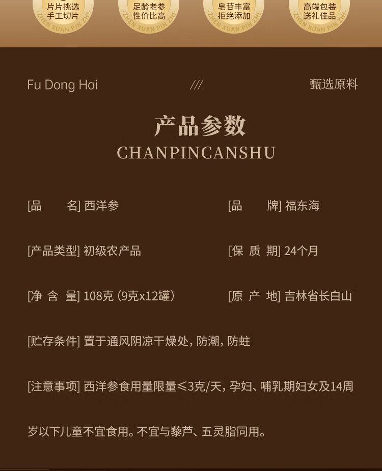 商品名称:【福东海】西洋参礼盒108克(9克x12罐)/盒(0.6-0.8)