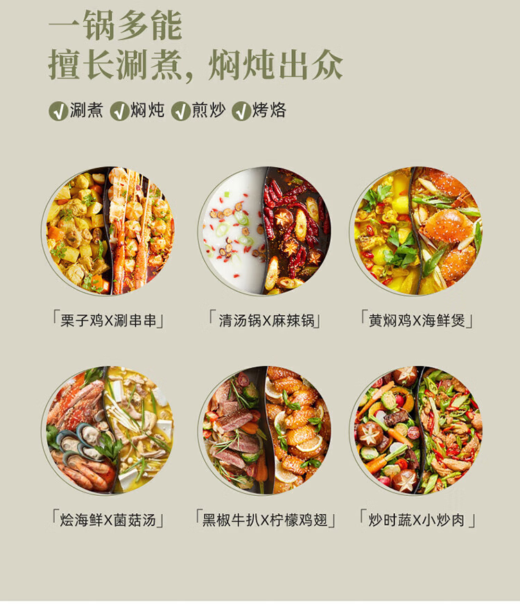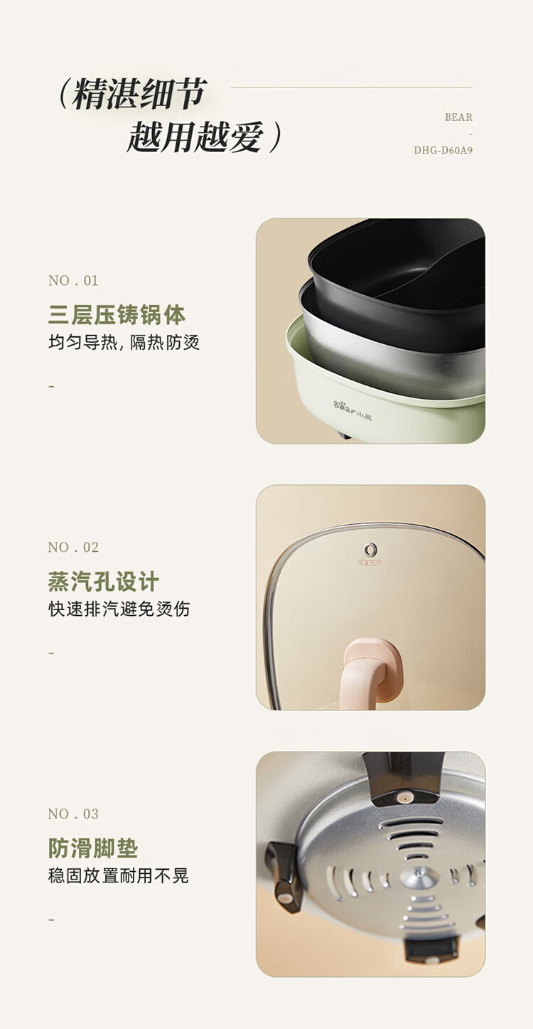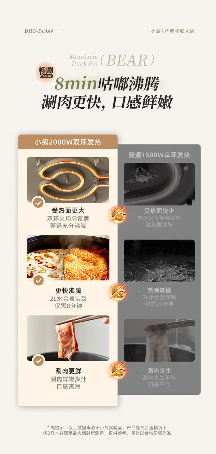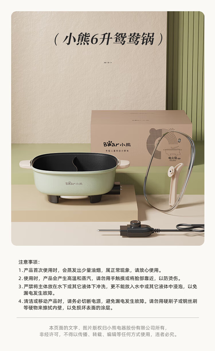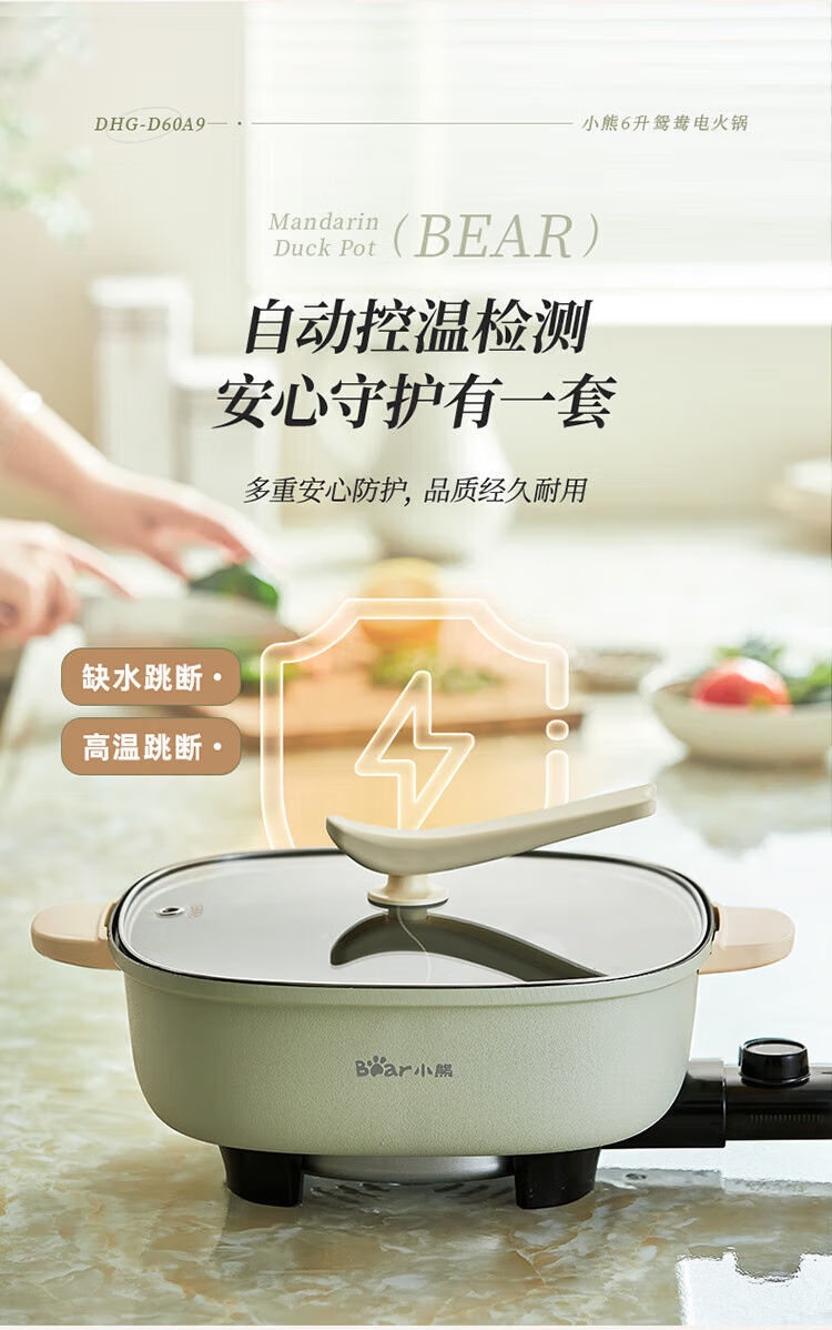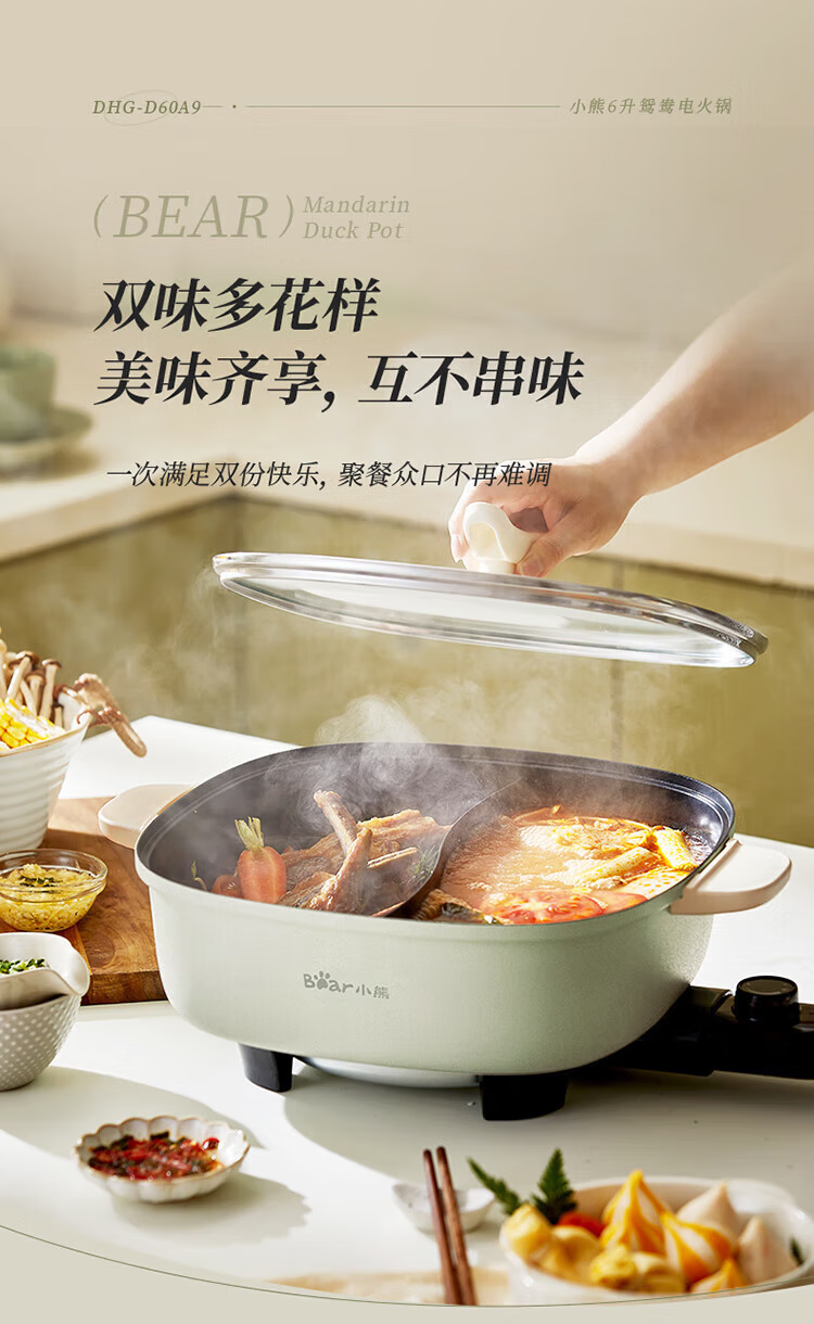 小熊 鸳鸯锅DHG-D60A9 电火锅6L大容量多用途锅多功能锅