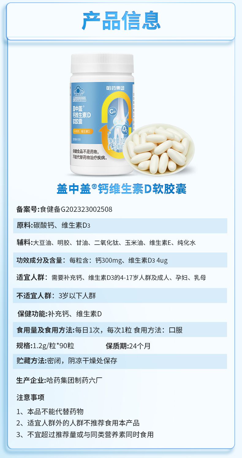 商品名称:哈药盖中盖 钙维生素D软胶囊 中老年青少年儿童学生补钙 2瓶