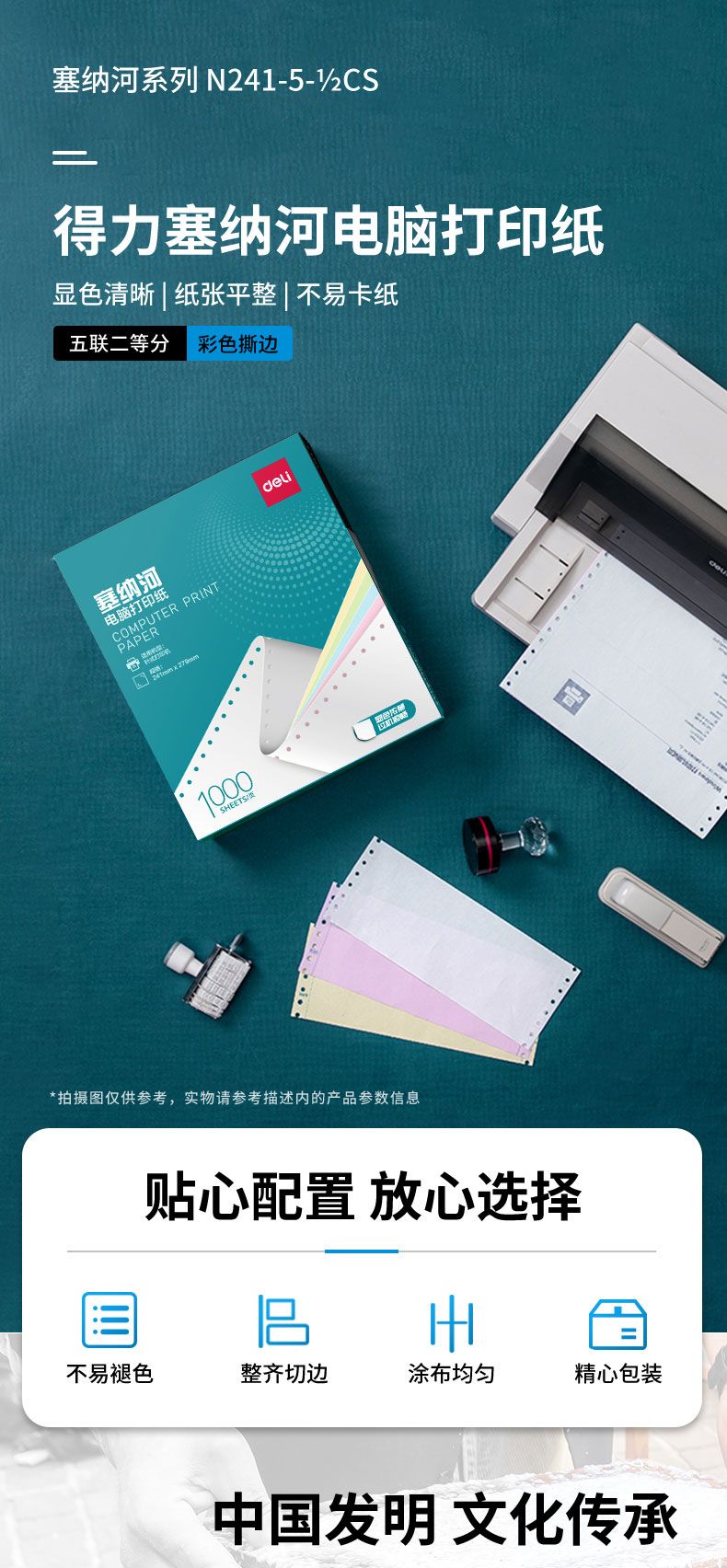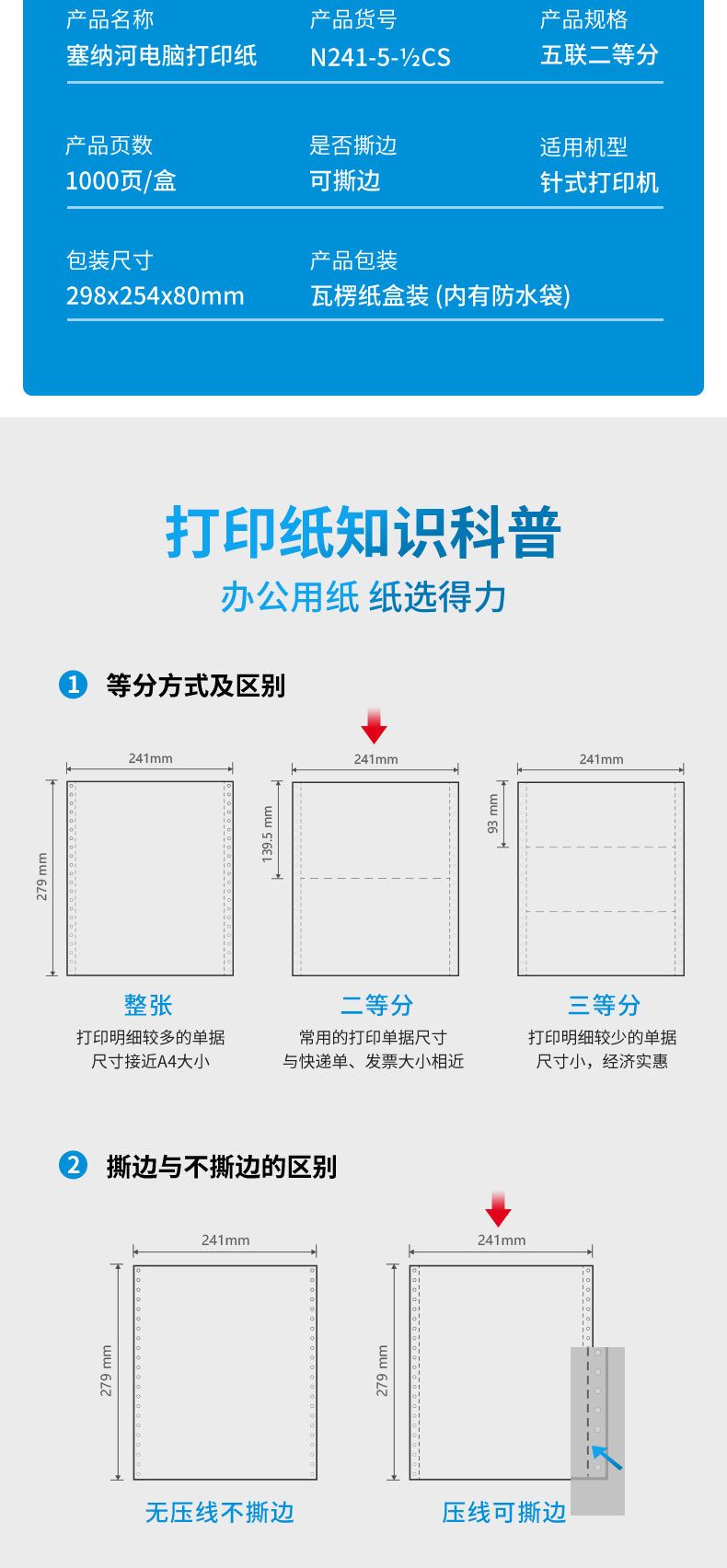 商品名称:得力 塞纳河N241-5电脑打印纸(1/2CS彩色撕边)(1000页/盒)*1盒