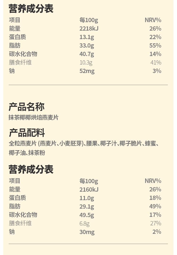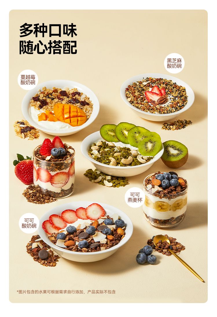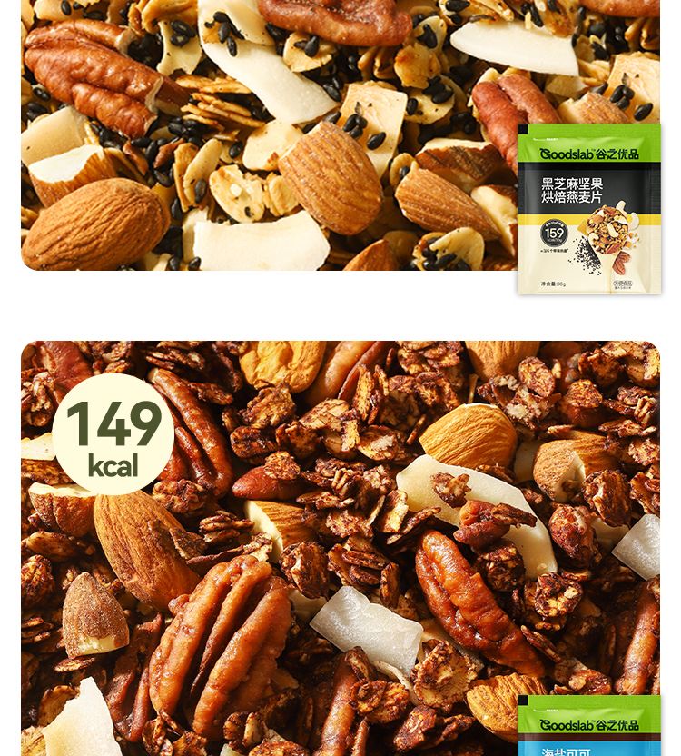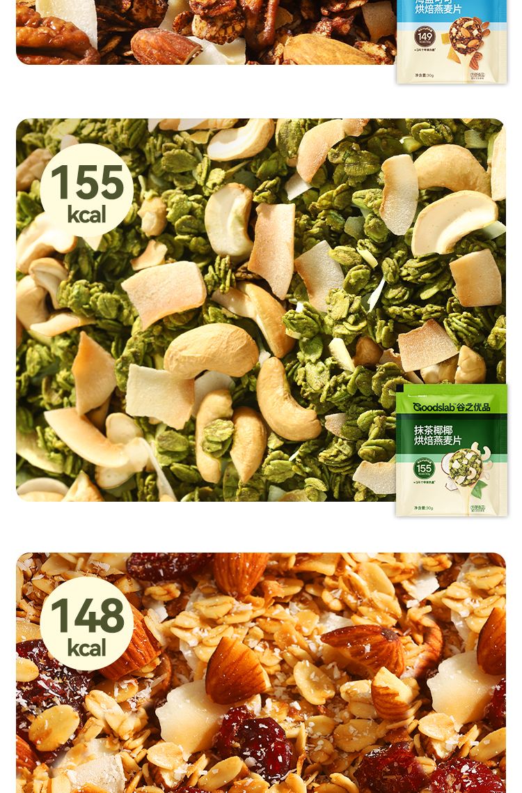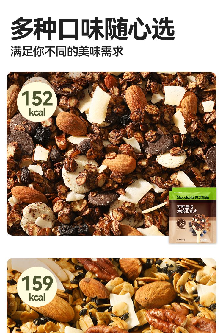 可可黑巧烘焙燕麦片30g*2袋,黑芝麻坚果烘焙燕麦片30g*2袋,椰蓉蔓越莓烘焙燕麦片30g*2袋,抹茶椰椰烘焙燕麦片30g*2袋,海盐可可烘焙燕麦片30g*2袋