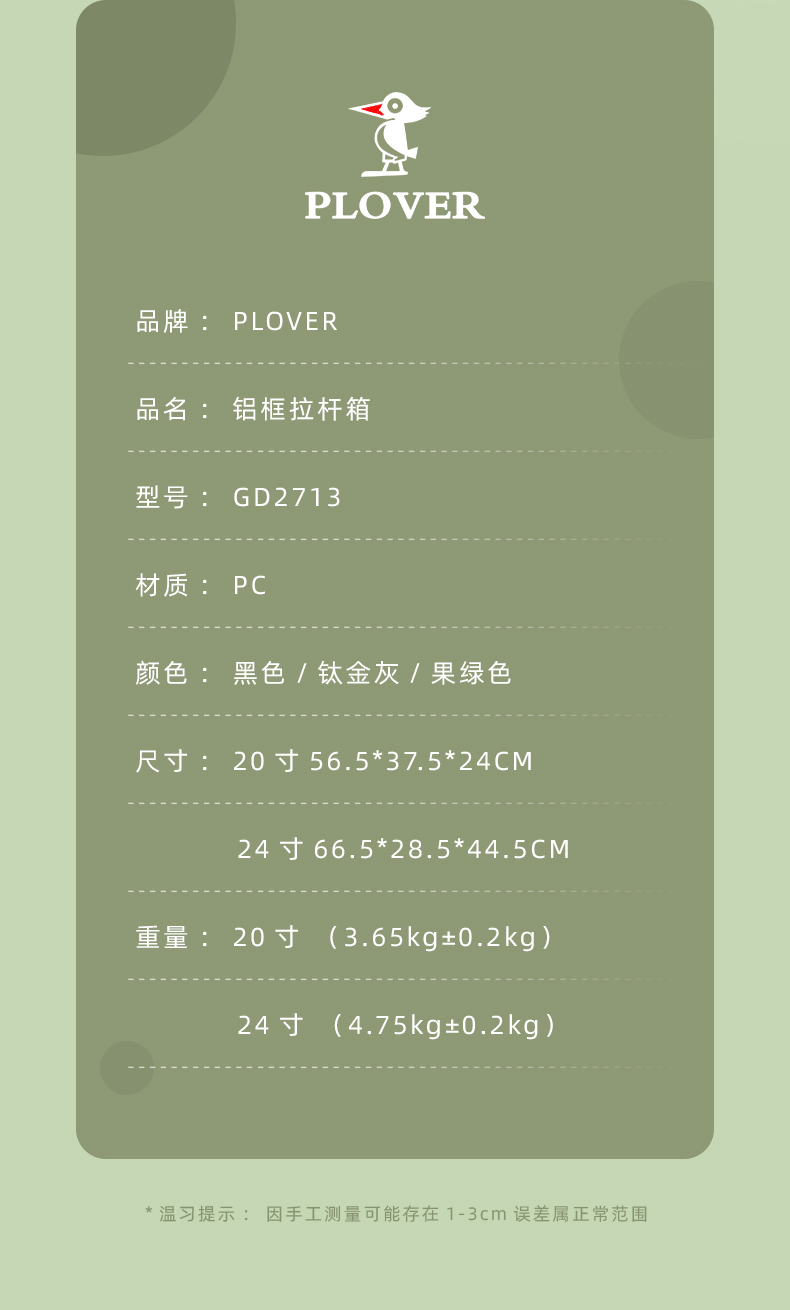 商品名称:PLOVER/啄木鸟铝框拉杆箱