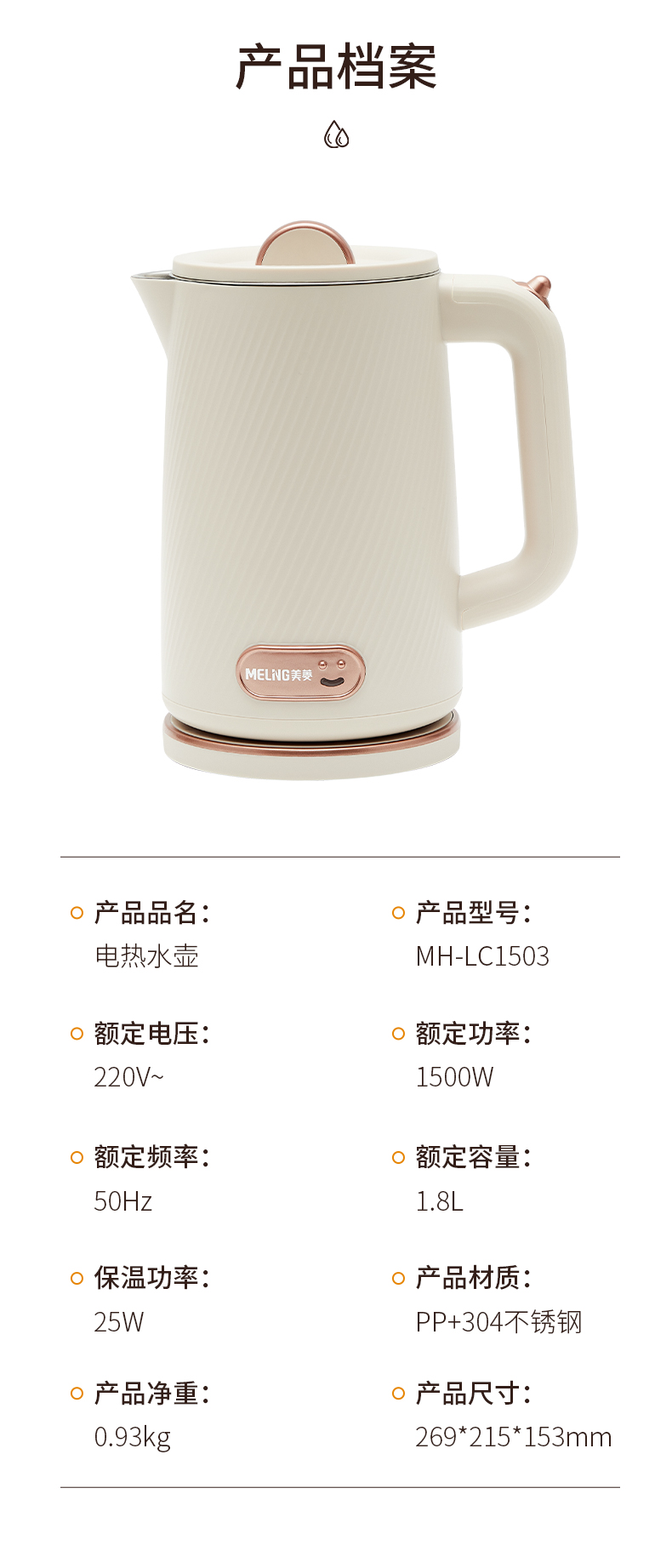 商品名称:MELING/美菱1.8升电热水壶MH-LC1503