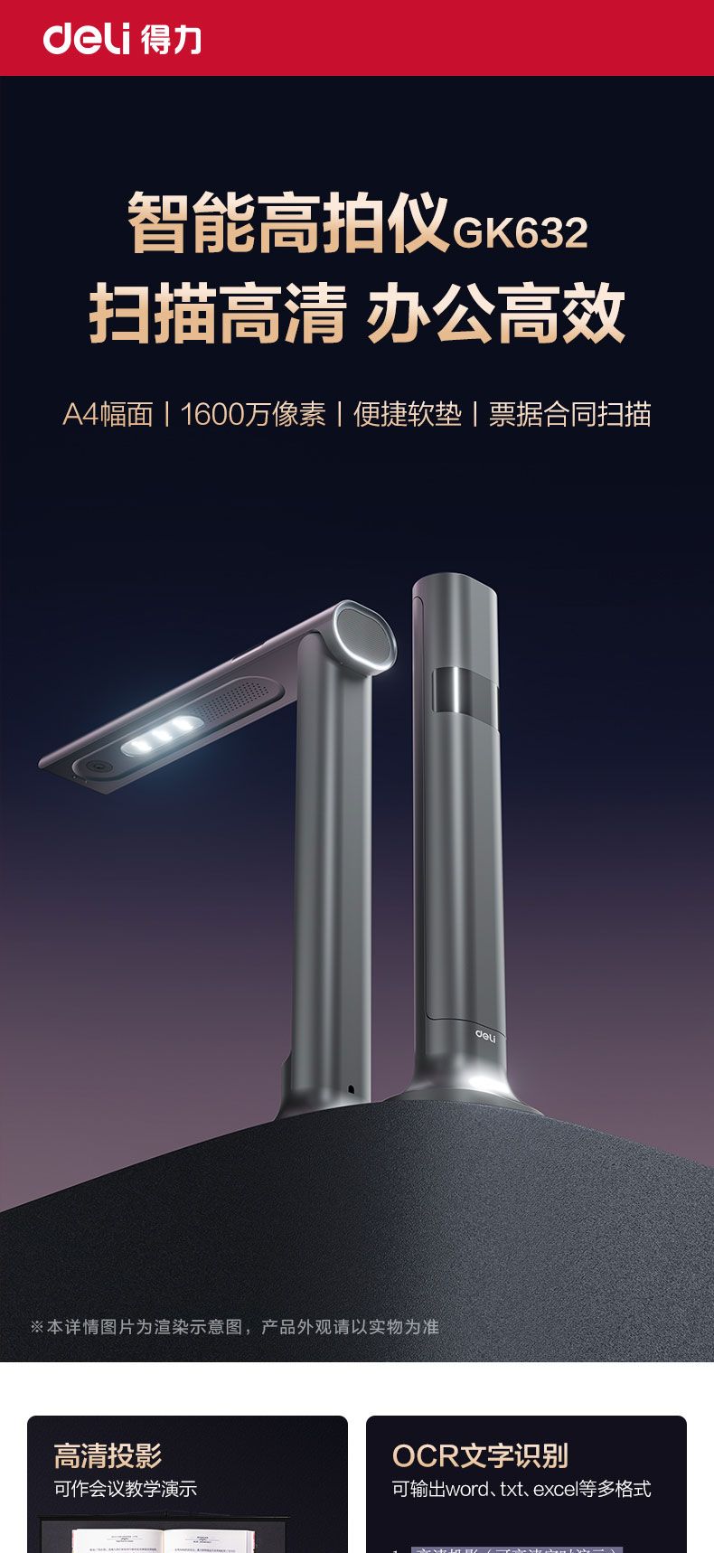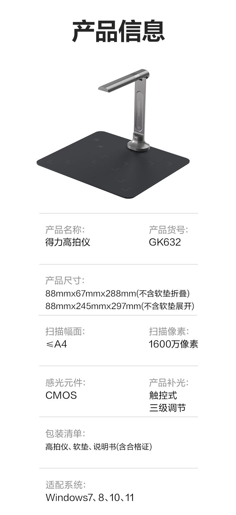 商品名称:得力 GK632高拍仪A4软底(灰)*1台