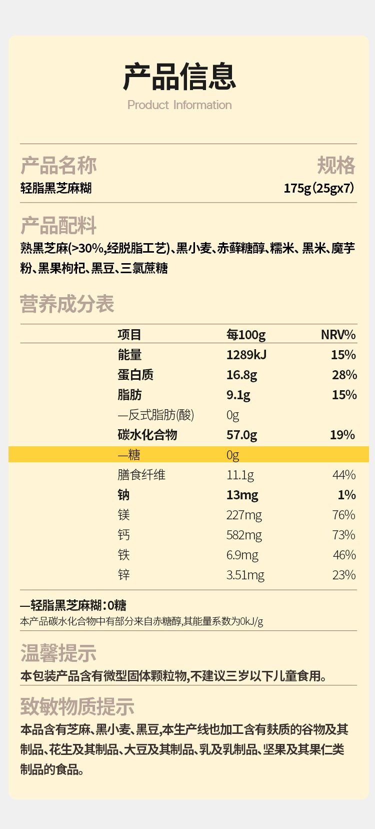 商品名称:谷之优品 轻脂黑芝麻糊175g (25g*7袋)/盒