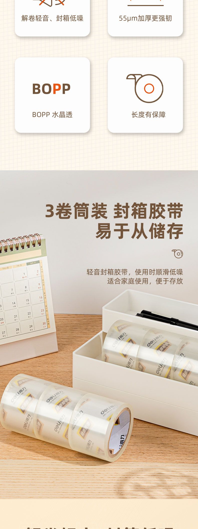 商品名称:得力 JD84轻音封箱胶带48mm*60m*55μm(高透)(3卷/筒)*3筒