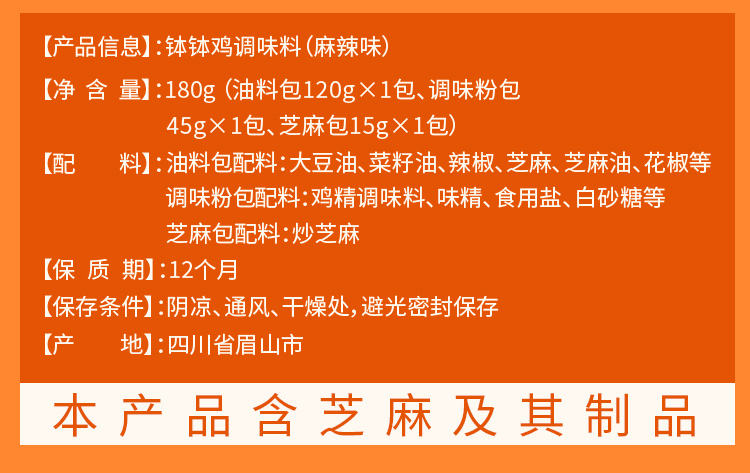 商品名称:川娃子乐山麻辣钵钵鸡调味料180g*5袋